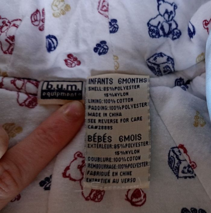 Vends combinaison pilote pour bébé avec moufles intégrés Taille 6 mois de marque B.u.m. équipment en très bon état, peu porté.