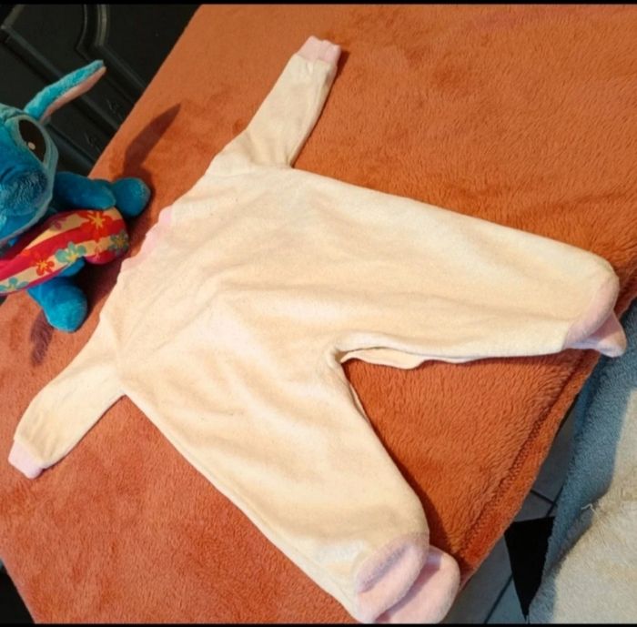 Couleurs : Blanc cassé/crème avec finitions rose pâle au col, aux poignets et aux pieds.