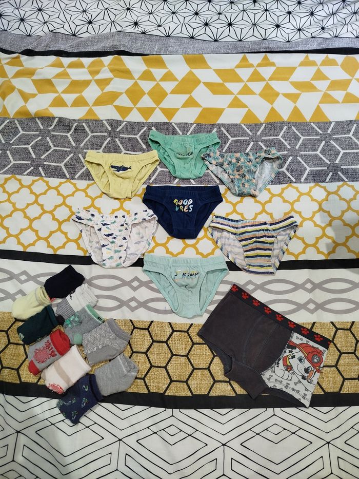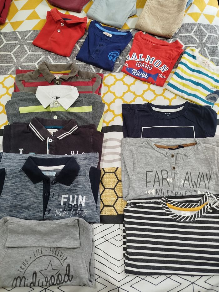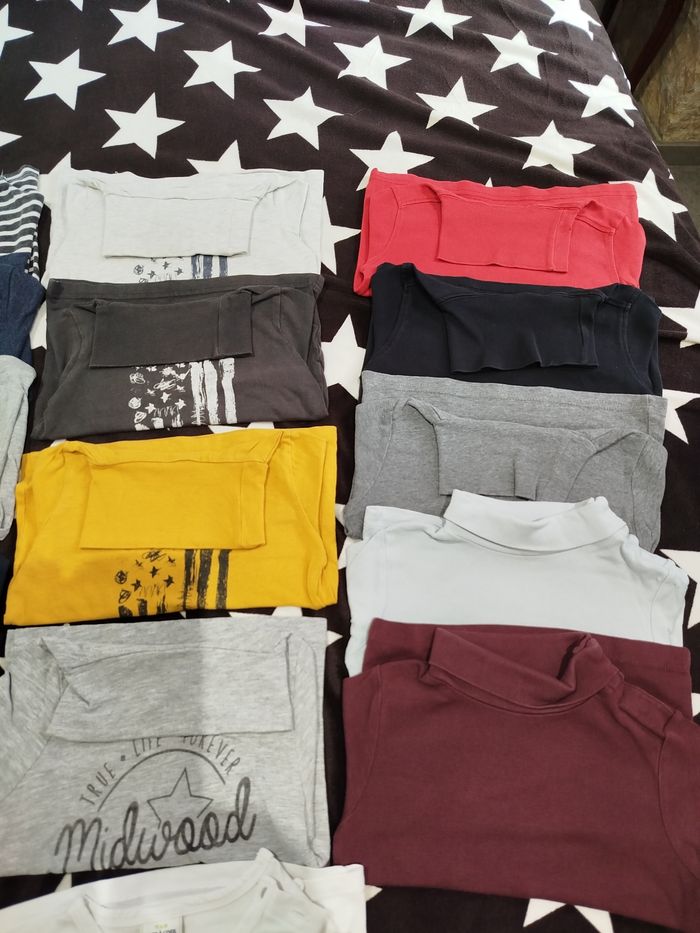 Pantalons, jeans, pulls, gilets, polos, tee-shirt manches longues, tee-shirt cols montants, 2 doudounes une noir et une rouge, sous-vêtements, chaussettes.