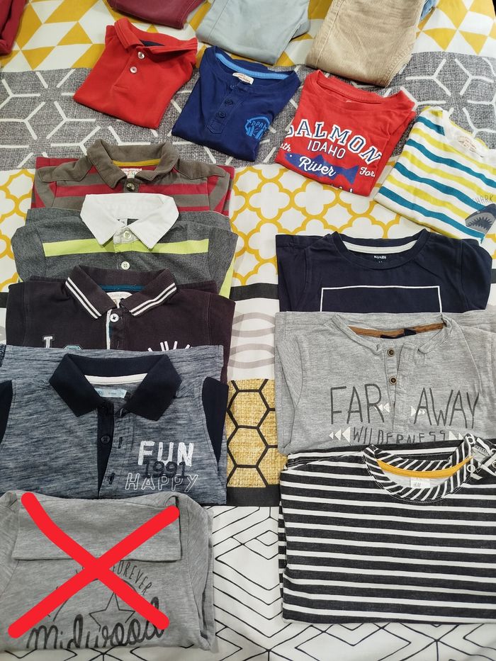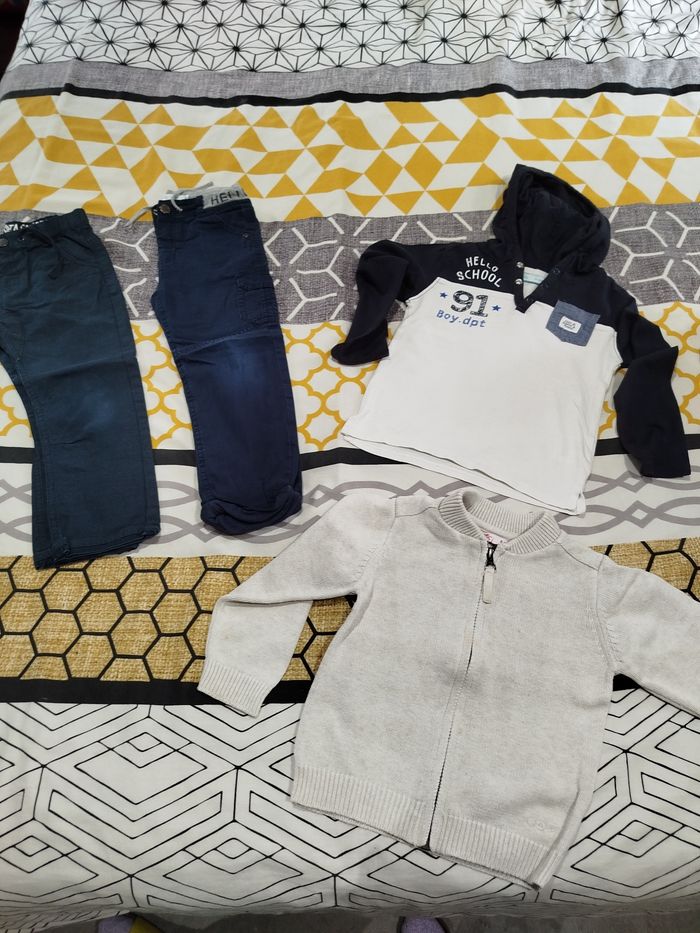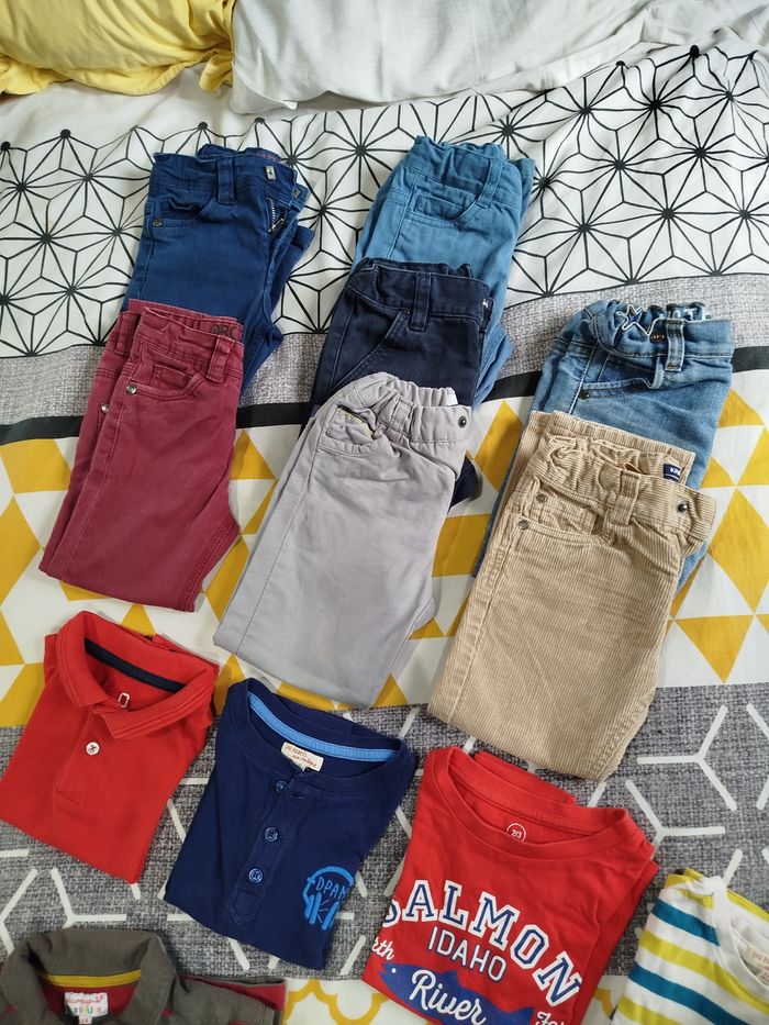 Gros lot de vêtements 3 ans hiver ou demi saison porté 1 saison (présence de petits défauts: usures et accros). Pantalons, jeans, pulls, gilets, polos, tee-shirt manches longues, 2 doudounes une noir et une rouge. Offert: sous-vêtements, chaussettes, les 2 pantalons troués aux genoux, un gilet et un tee-shirt manches longues ( voir les 2 derrières photos). Si besoin d'informations complémentaires ou photos n'hésitez pas.