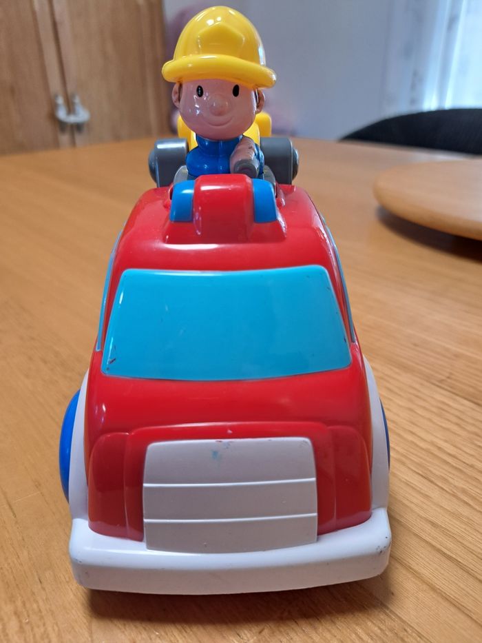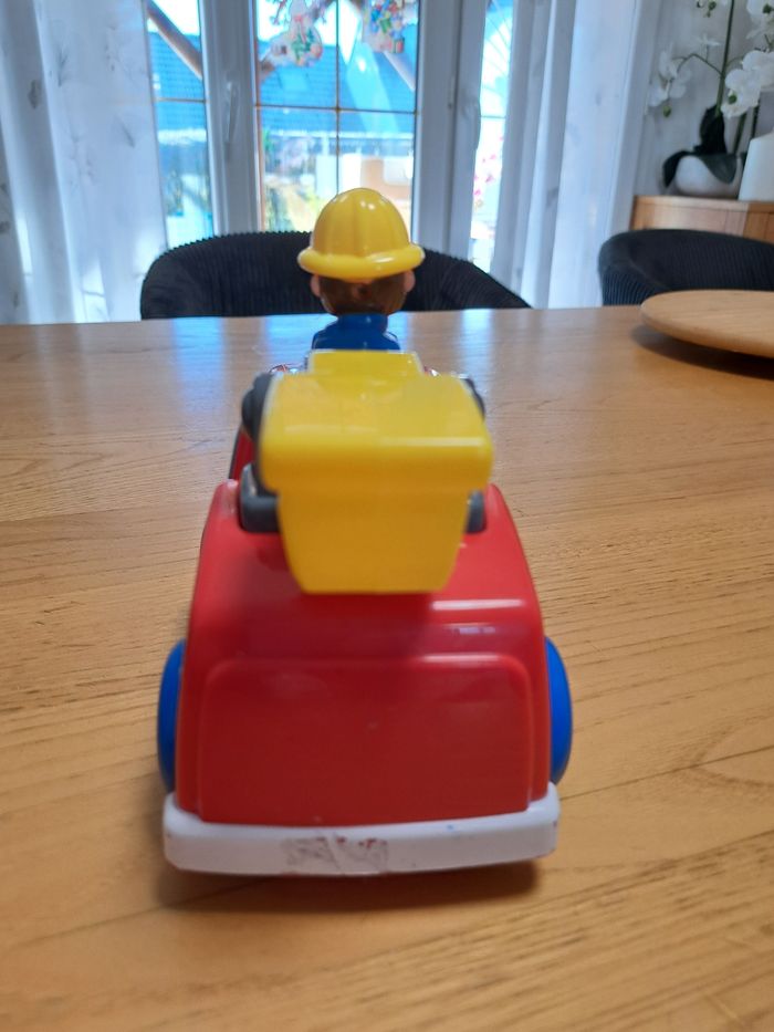 Camion pompier qui avance tout seul quand on appuie sur la tête du pompier. Quelques traces d'usures. Fonctionne très bien. Sans pile.