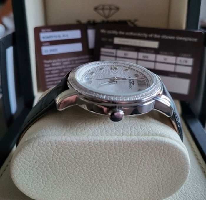 Matière du boîtier : Acier inoxydable, lunette sertie de diamants.