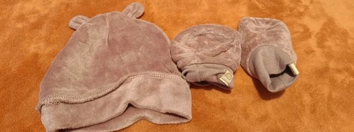 Composition : L'ensemble comprend un bonnet avec de petites oreilles rigolotes et une paire de moufles (gants) assorties.