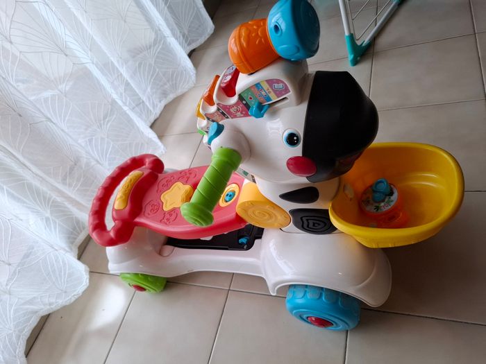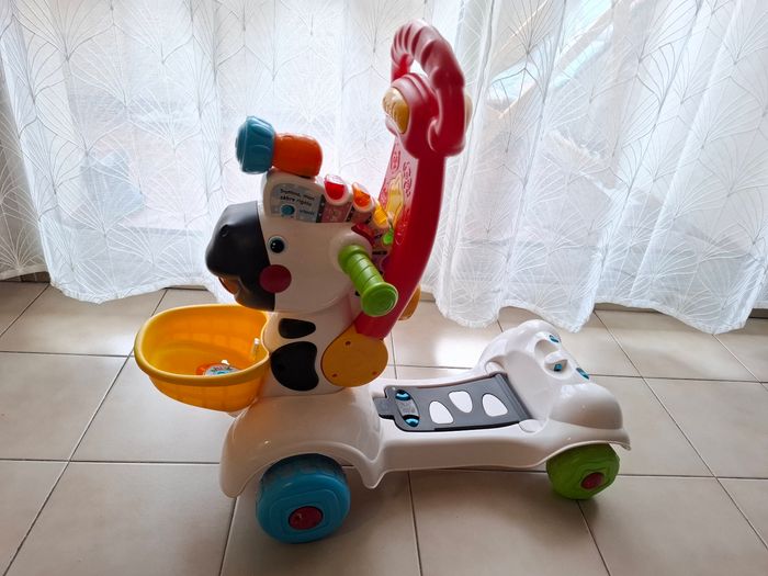 Je vends ce porteur, trotinette, trotteur, tableau musical 4 en 1 interactif de la marque Vtech. - Type de produit : Jouet d'éveil - Marque : V-Tech - Âge recommandé : De 1 à 3 ans - Fonctionnalités : Sonore, musical, avec différents boutons et formes à manipuler 3 fonctions évolutives : trotteur (12 mois et +), porteur (18 mois et +) et trottinette (24 mois et +) Très bon état. Motricité, développement de l'équilibre, reconnaissance des couleurs, reconnaissance des animaux.