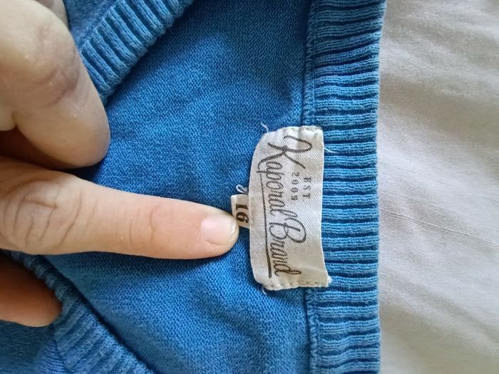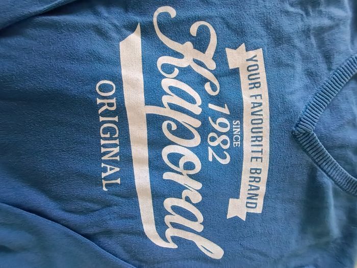 Pull bleu Kaporal col V avec logo blanc devant. Taille 16 ans, avec un trou sous l'aisselle gauche. Envoi rapide, prix négociable.