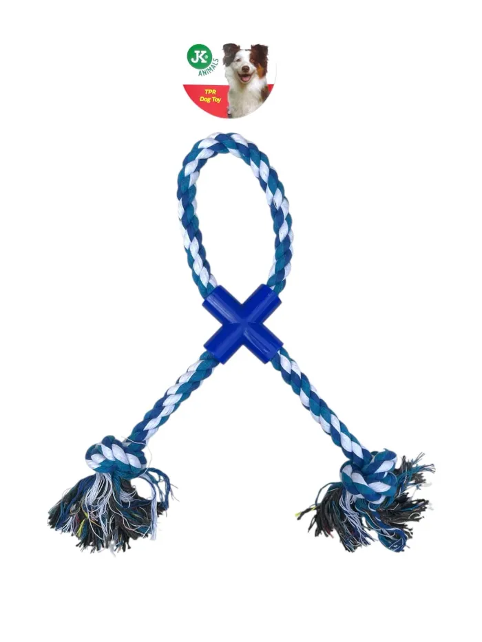 Jouet pour chien en corde tressée bleue et blanche, avec croix en plastique au centre et deux nœuds aux extrémités. Longueur : 39 cm. Idéal pour tirer, mâchouiller ou jouer à deux. Solide, pratique et adapté à tous les chiens. Marque : JK Animals