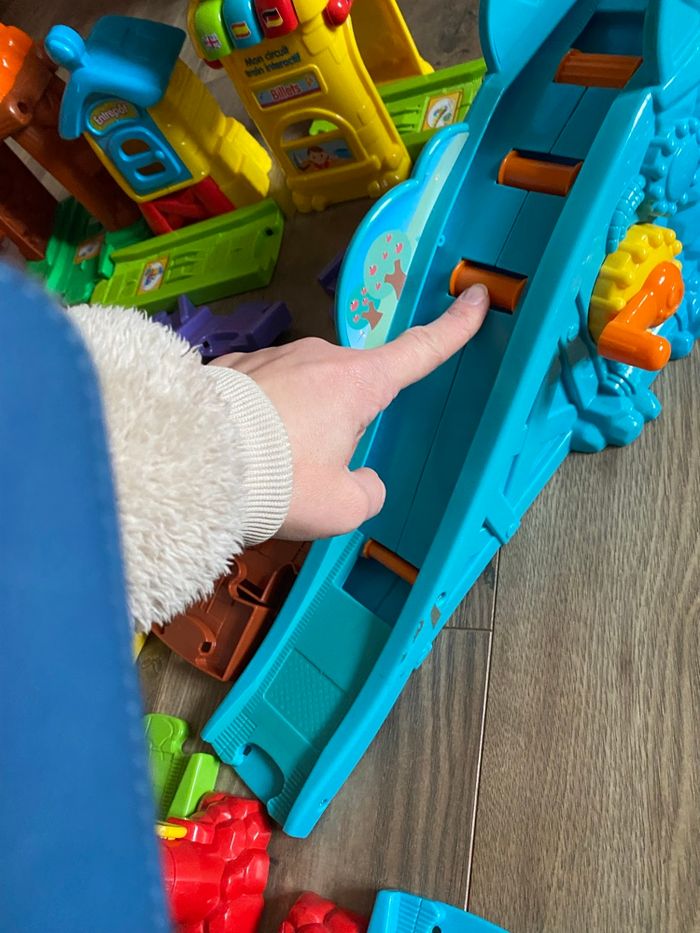 Attention, la montée montagne bleue montrée en photo n’a plus son caoutchouc pour faire monter le train, donc il faudra pousser le train le temps de la montée mais n’a pas empêché ma fille de jouer des heures entières avec le circuit.
