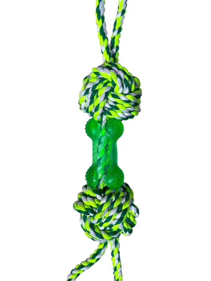 Jouet pour chien en corde tressée résistante, avec os en caoutchouc TPR vert (8 cm). Longueur totale : 48 cm. Parfait pour les jeux de traction et de mastication. Robuste et amusant, ce jouet favorise l’exercice physique tout en satisfaisant le besoin naturel de mastiquer. Marque : JK Animals