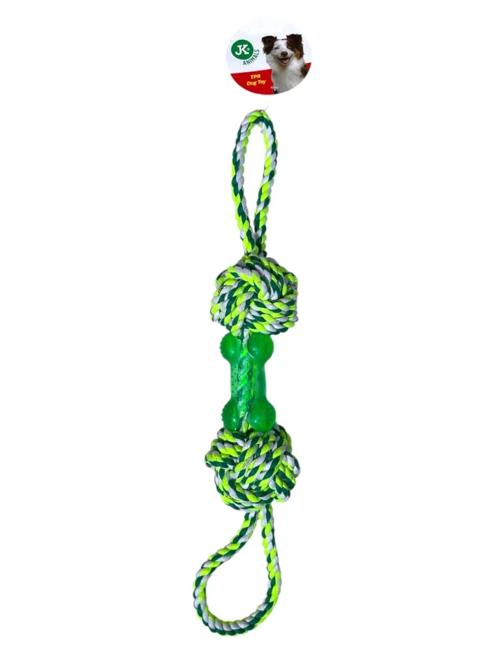 Jouet pour chien JK Animals en corde tressée + os en caoutchouc TPR vert 48 cm Neuf