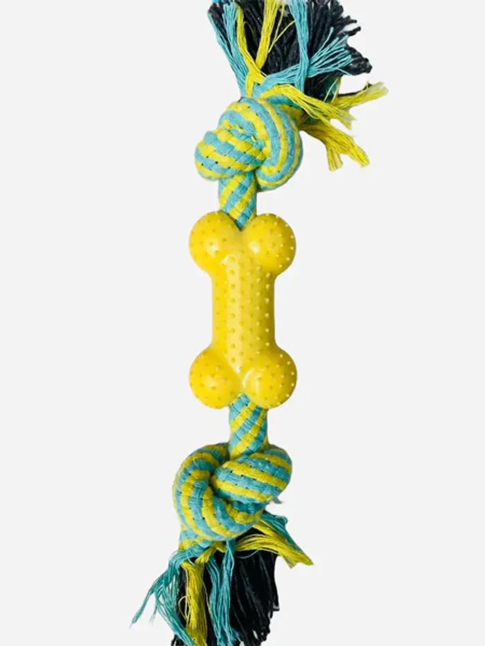 Jouet pour chien en corde tressée résistante, avec os en caoutchouc jaune (8,5 cm). Longueur totale : 29 cm. Compact et pratique, ce jouet est parfait pour les jeux de traction et de mastication. Sa taille est idéale pour les chiens de petite à moyenne taille. Solide, coloré et confortable à mordiller. Marque : FORPET
