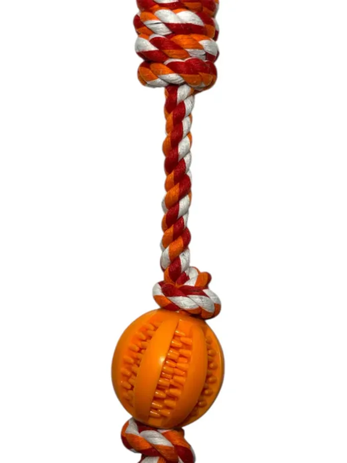 Jouet pour chien en corde tressée résistante, équipé d’une balle de mastication orange. Longueur totale : 35 cm. Idéal pour les jeux de traction et de mastication, ce jouet aide à renforcer la mâchoire et à maintenir une bonne hygiène bucco-dentaire. Conçu pour résister aux morsures, il stimule et occupe votre chien tout en rendant le jeu amusant. Marque : Lynpet