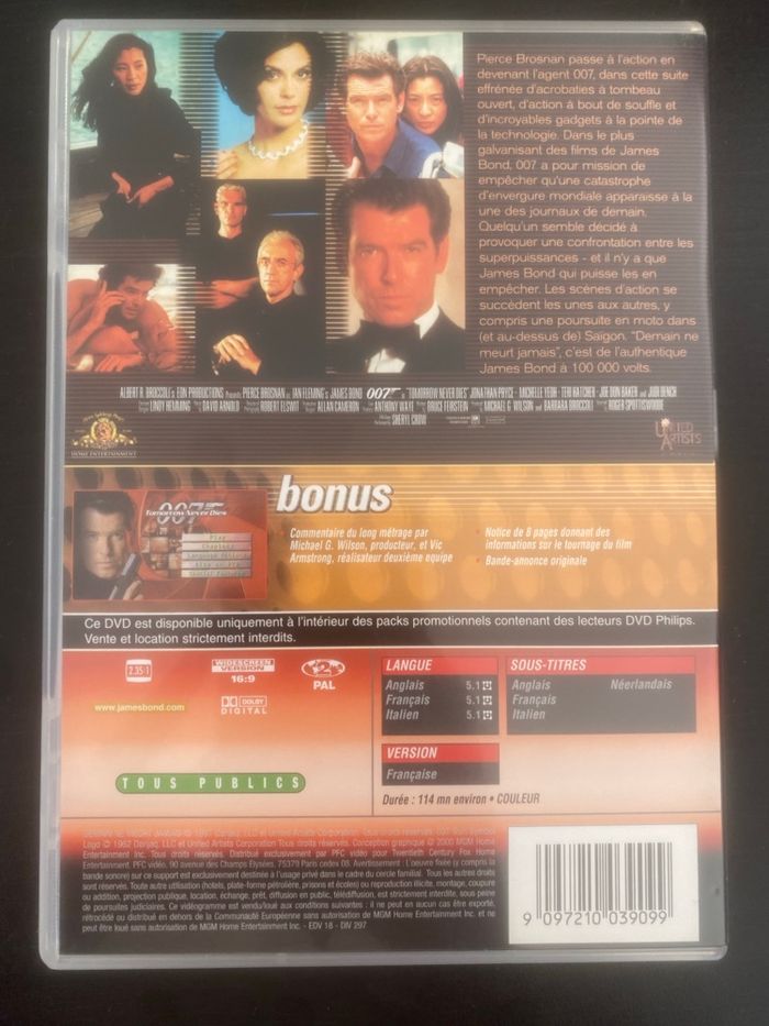 📀 DVD James Bond 007 – Demain ne meurt jamais (1997), avec Pierce Brosnan dans le rôle emblématique de l’agent secret. Film d’action et d’espionnage rythmé mêlant poursuites spectaculaires, gadgets high-tech et intrigue internationale autour de la manipulation médiatique. Édition DVD MGM en version française, format widescreen 16:9, Dolby Digital, avec bonus (commentaires, bande-annonce, informations sur le tournage).