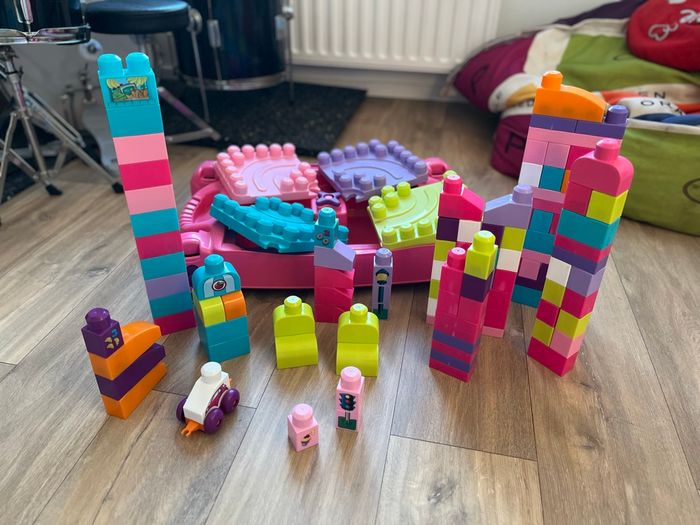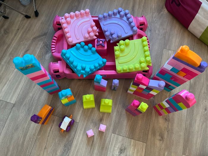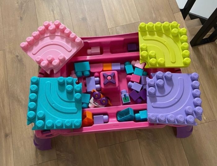 Vends table d'apprentissage Mega Bloks rose avec 106 blocs de construction, en très bon état.