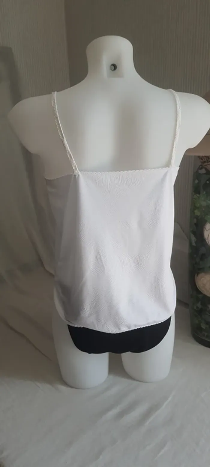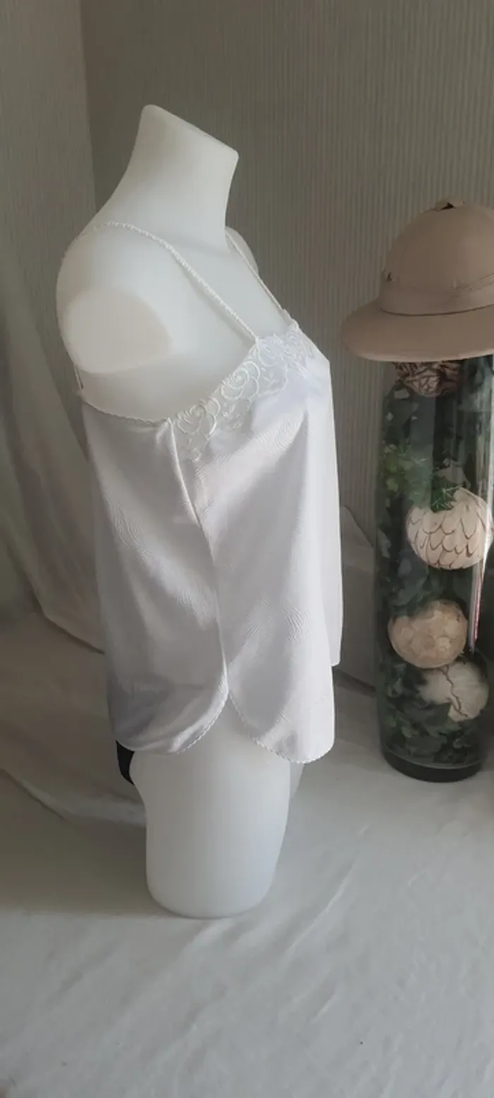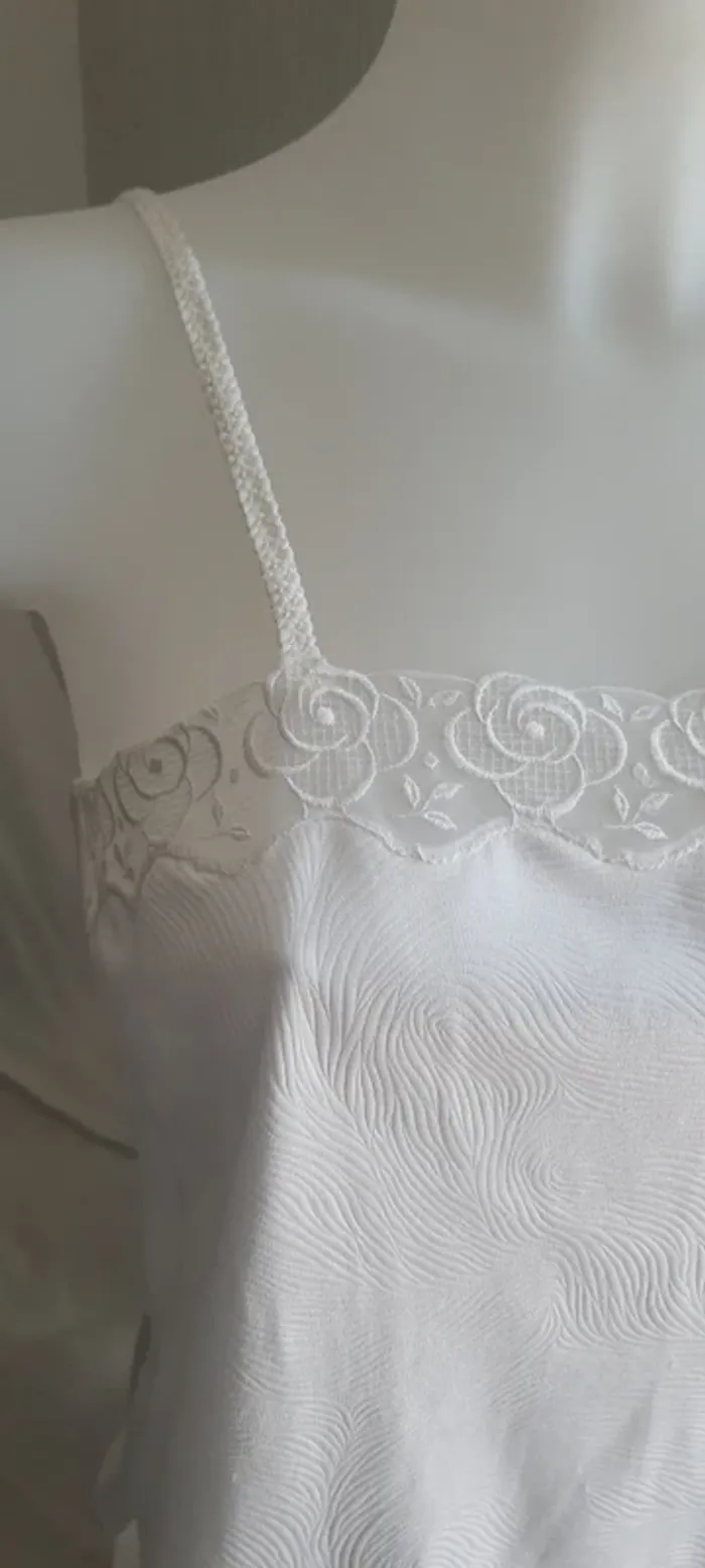 Caraco blanc "satin" gauffré Haut en dentelle, bretelle spaghetti Dimensions à plat: sius aisselle 40 cm., hauteur 52 cm.