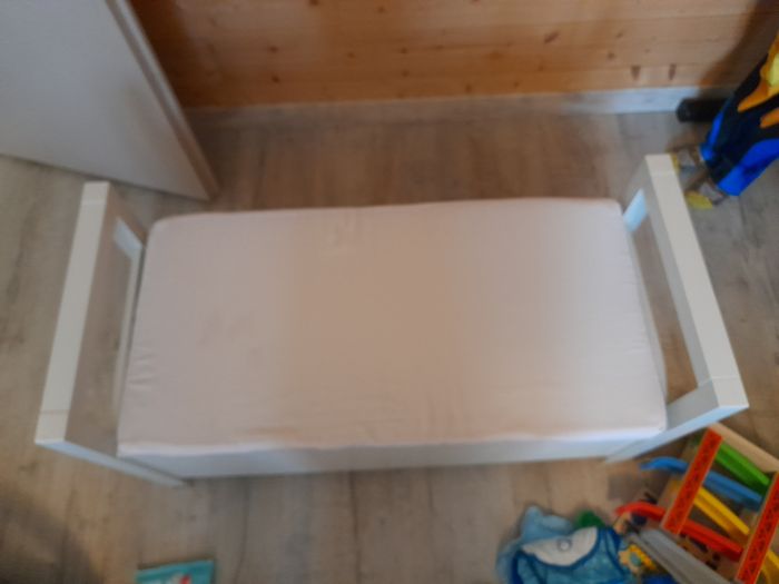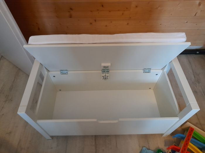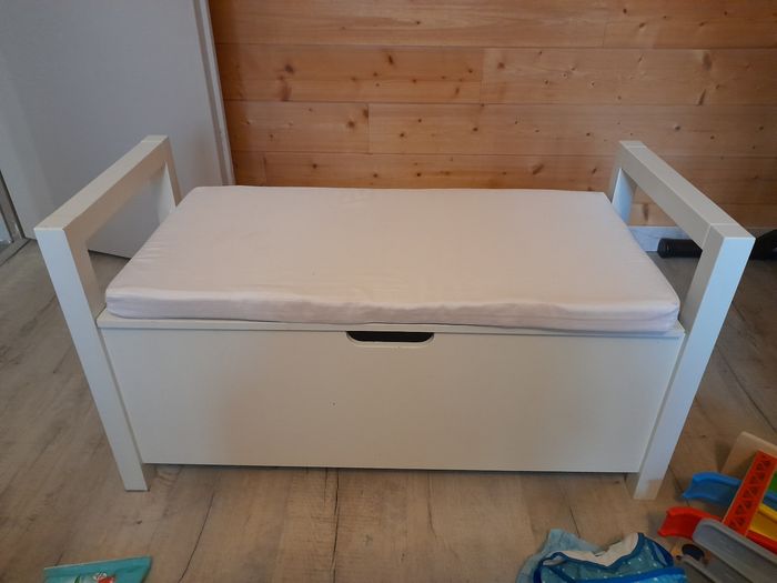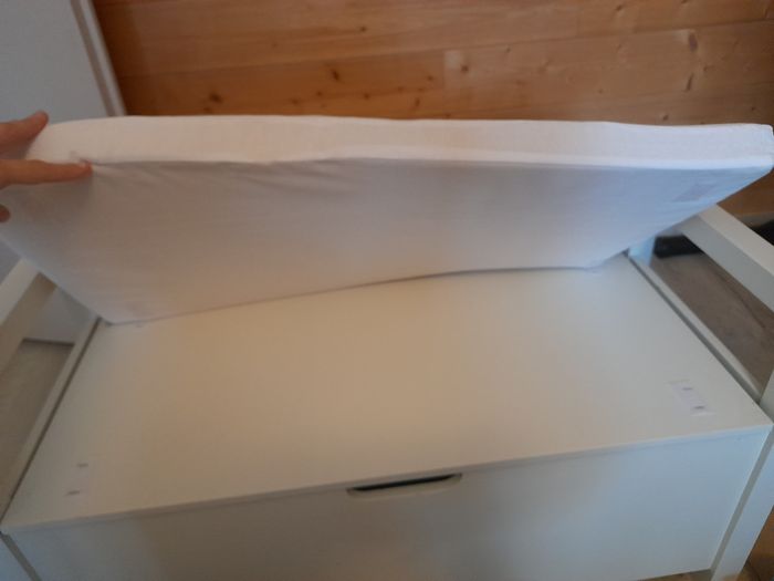 Coussin dehoussable et lavable, se fixe avec des scratchs au banc.