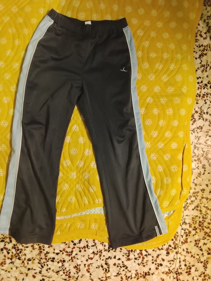 Bonjour, très beau pantalon a offrir pour Noël de la marque Domyos en gris avec.une bande en bleu ciel et blanc . Elastiquer en haut de la taille. 100% polyester. En très bon état et sans étiquette ; hauteur jambe: 76cm, largeur : 24cm. Pensez a vos cadeaux de fin d'année.