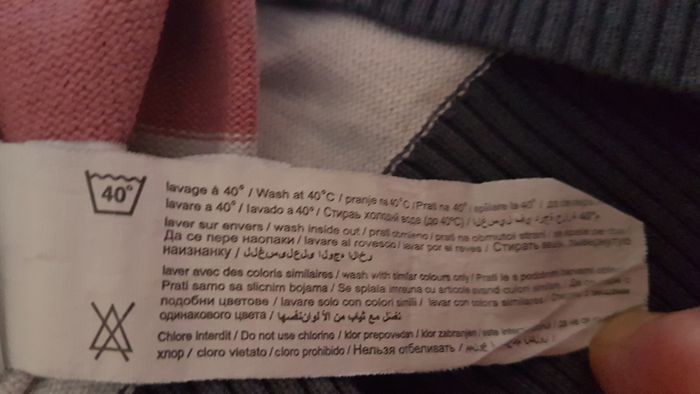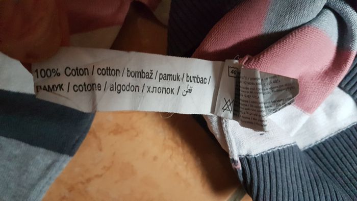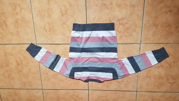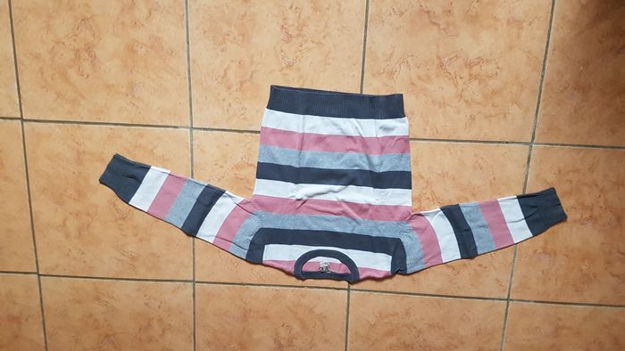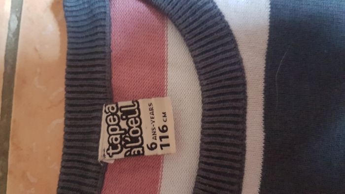 Pull rayé garçon Taille 6 ans Couleur grosses rayures grises foncées, claires, roses et blanches Manches longues Col rond Marque Tape à l'oeil