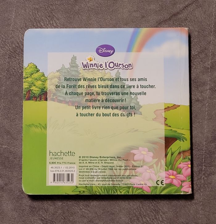 Bonjour, Je vends ce livre nommé - Winnie L'Ourson - Mon petit livre à toucher - en bon état. Si vous rechercher un livre ou un acteur en particulier et pour gagner du temps, n'hésitez pas à me le demander, je vous répondrais dès que possible 😇 Veuillez vous abonner pour recevoir toutes les nouveautés Pour autres infos n'hésitez pas à me contacter. ***** Merci de votre visite *****