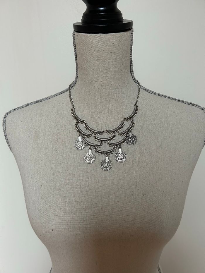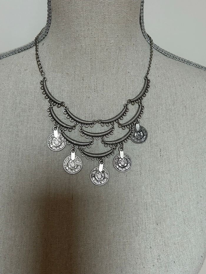 Collier style bohème/ethnique en métal argenté, avec plusieurs rangées et pampilles façon pièces anciennes gravées