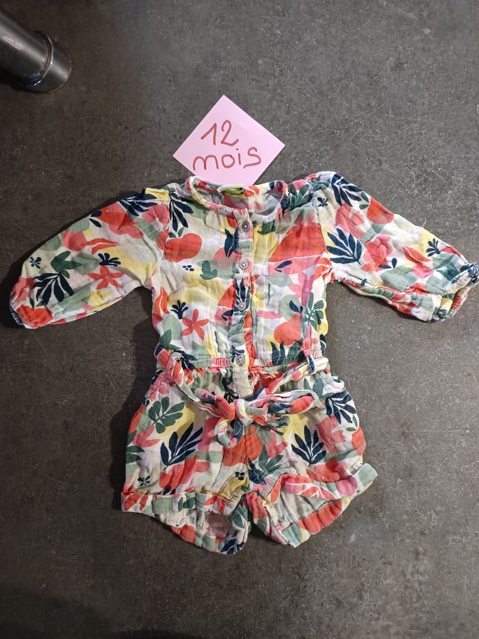 Combishort fleurie manches longues en gaz de coton avec sa petite ceinture assortie, Ouverture à l'entrejambe Très bon état Taille 12 mois