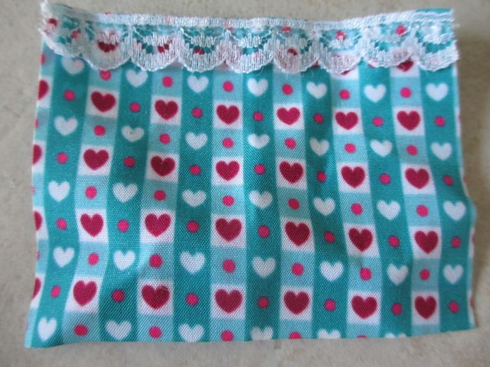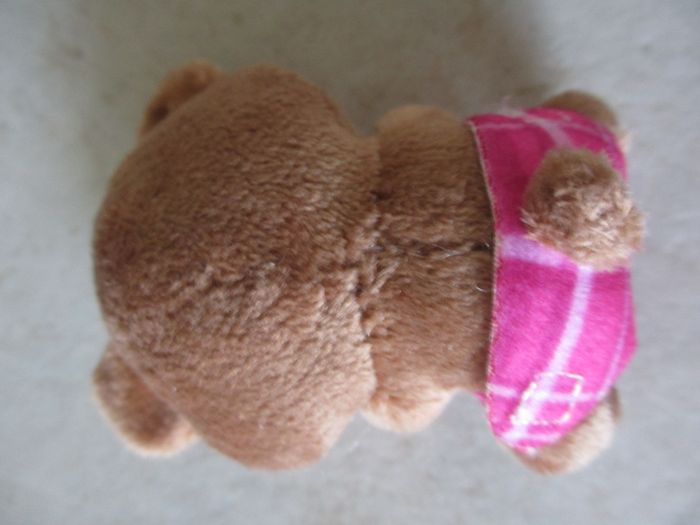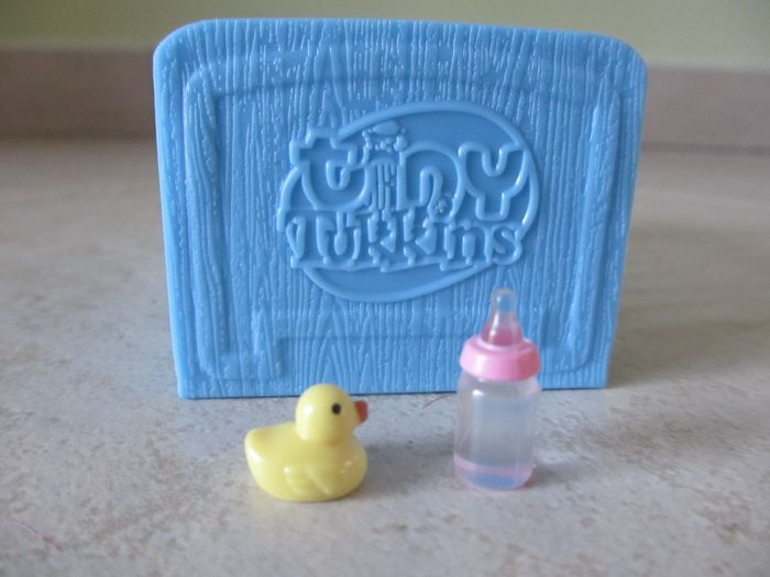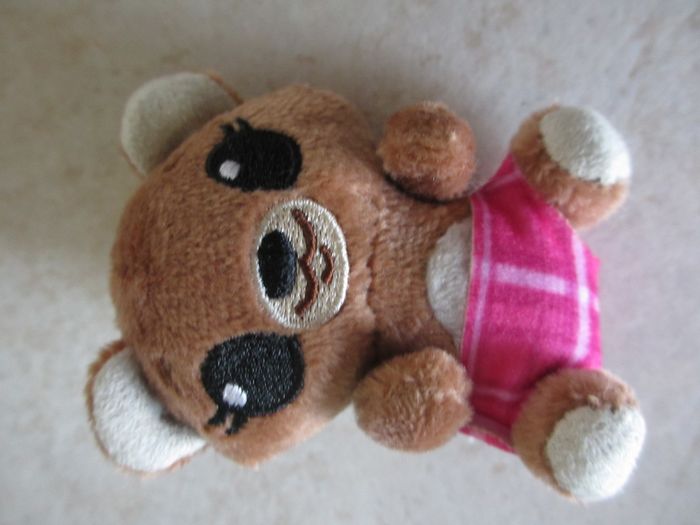 Petit nounours dans son lit avec accessoires Hauteur du nounours : 7 cm. Très bon état (comme neuf).
