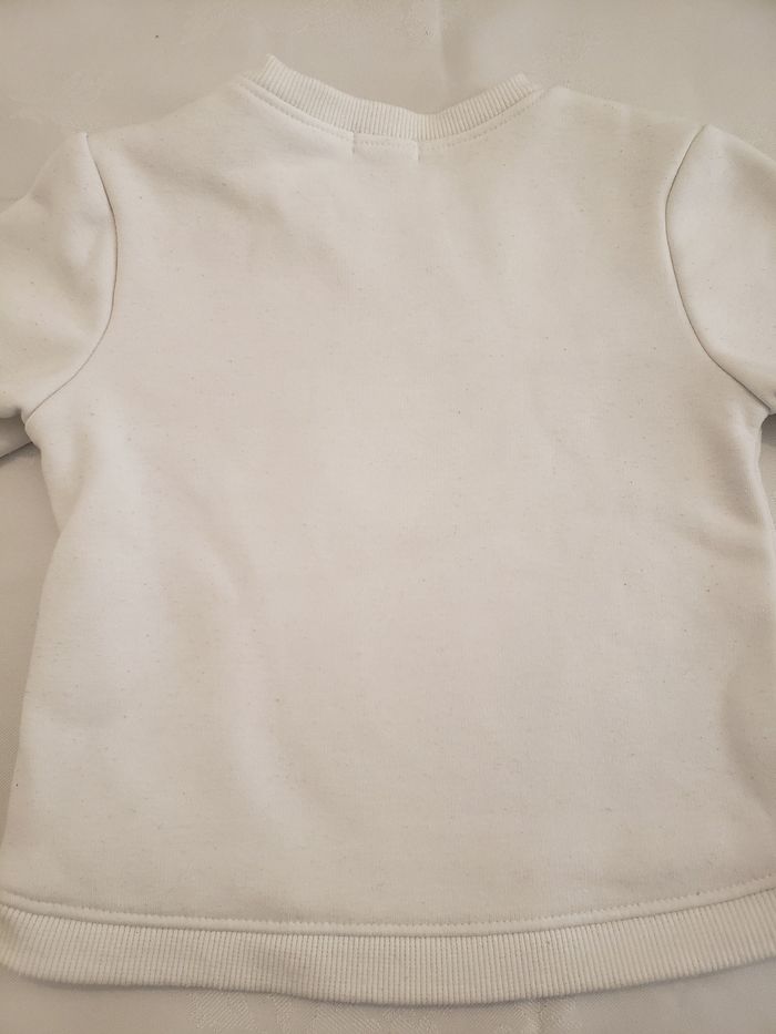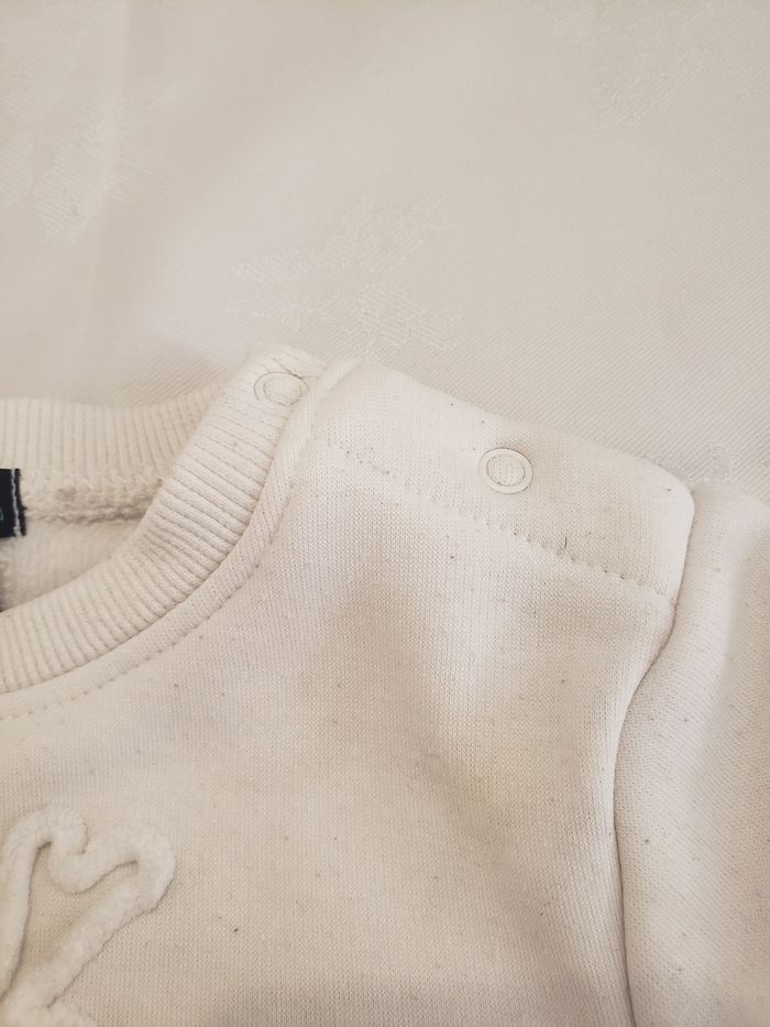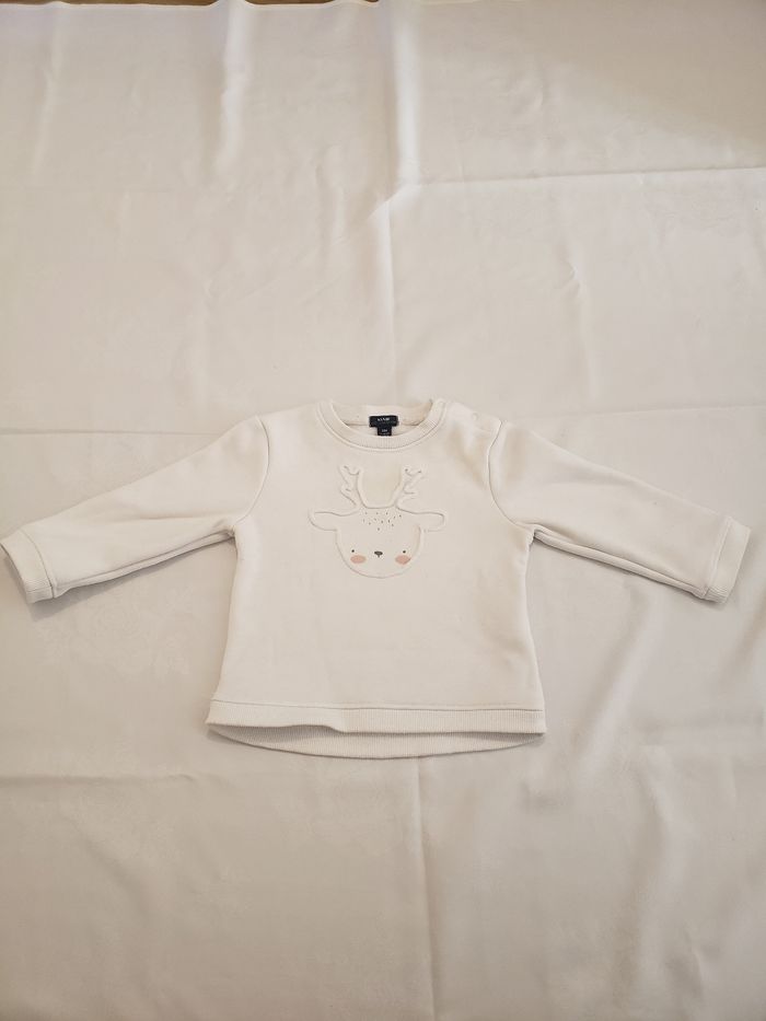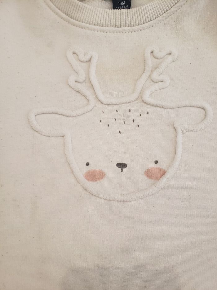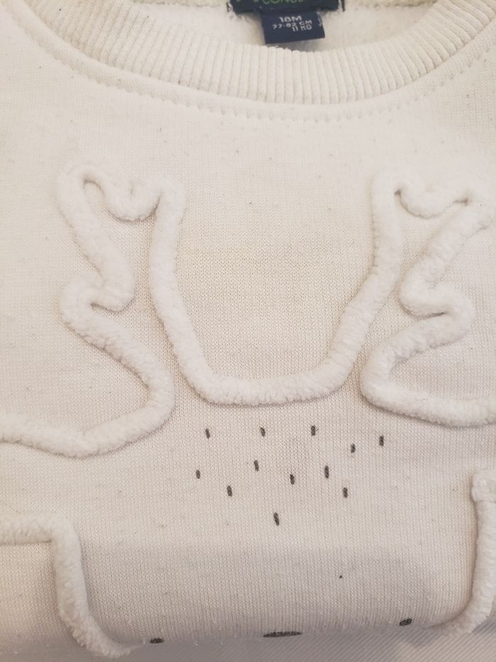Il est blanc avec un motif renne dont le contour du renne est en relief doux. Le tissu est épais et l'intérieur est en tissu doux.