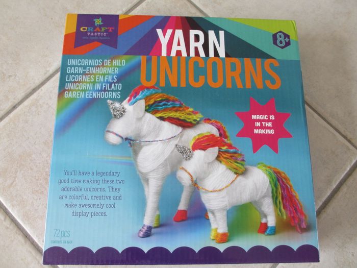 Kit de création licornes en fils Craft Tastic A partir de 8 ans. Les enfants prennent les formes en carton et les enveloppent avec du fil. Ensuite, ajoutez les sabots, les brides, les queues et les crinières colorées. Ajoutez les cornes pailletées et vous avez la magie de la licorne. Le kit comprend : 76,2 m de fil acrylique, 18 pièces de carton, 2 tiges de chenille, 36 pièces d'adhésif, 7,8 m de fil de coton, 1 pièce de feutre acrylique, 1,5 g de paillettes. Etat neuf (jamais ouvert).