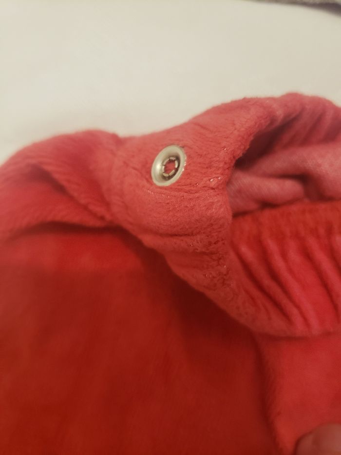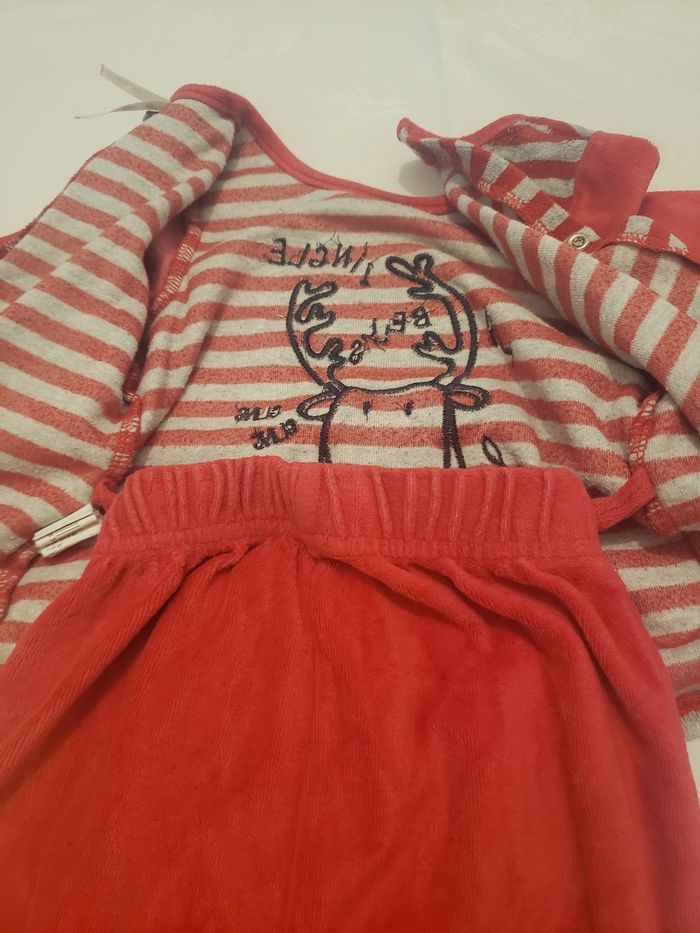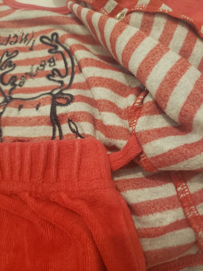 Il possède un haut qui se ferme par l'arrière avec des boutons pression. Le dessin du renne est en relief. Le pantalon se termine avec des pieds fermés.