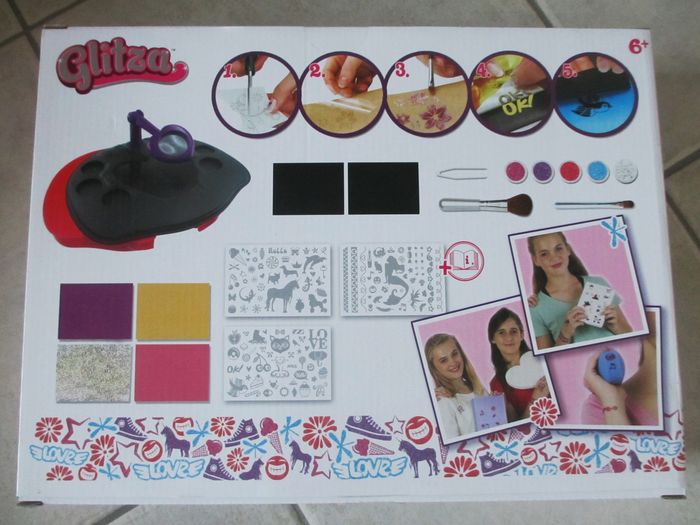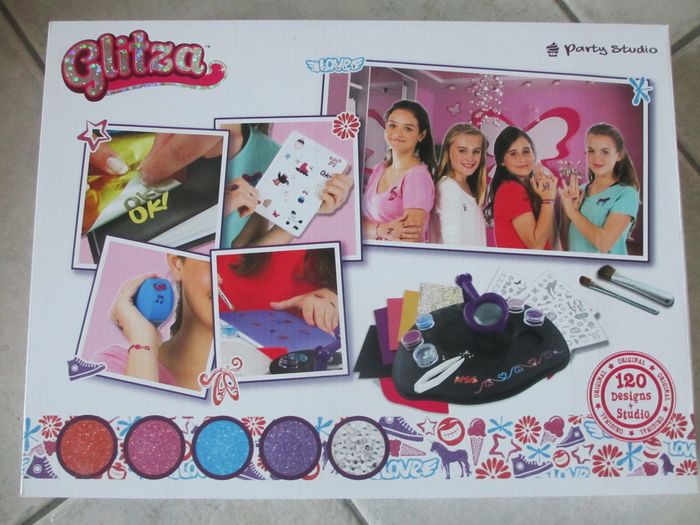 Glitza Party Studio - Sycomore Dès 6 ans. Un kit créatif pour se tatouer la peau ou personnaliser ses accessoires. Bon état (une partie des motifs a été utilisée : voir photos).