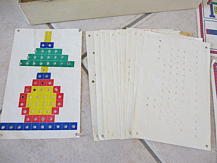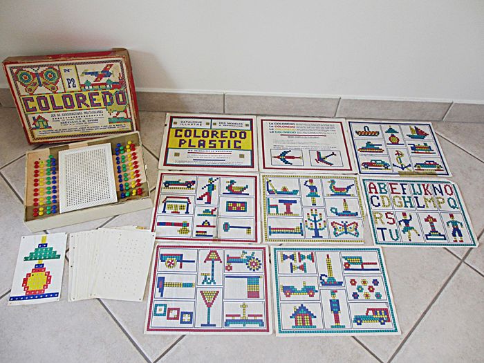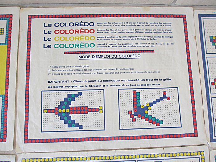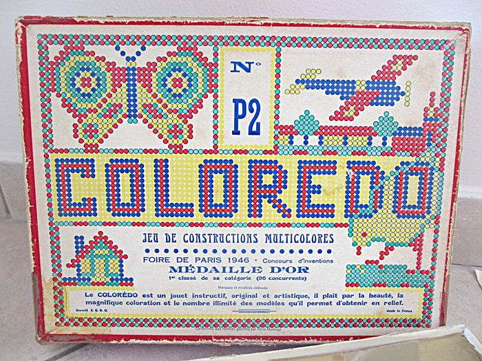 Jeu d’allumettes Coloredo P2 Dès 3 ans. Jeu instructif, original et artistique récompensé d’une médaille d’or à la Foire de Paris en 1946. Bon état (il manque 2 allumettes : 1 rouge et 1 jaune, les feuilles de modèles sont tachées ou abîmées et la boîte est très abîmée).