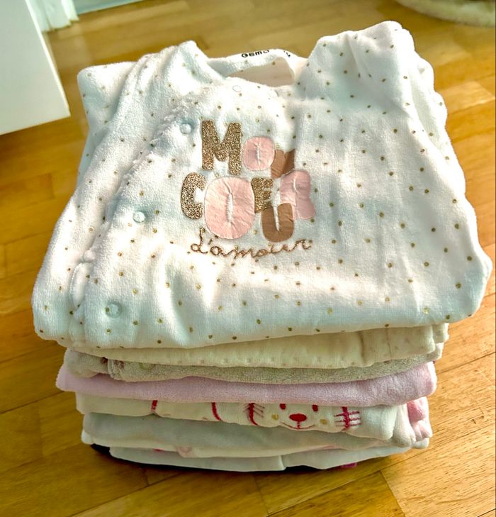 Lot de 11 pyjamas en taille 1 mois. Un ensemble parfait pour garder bébé bien au chaud avec des matières douces et confortables. 📋 Composition du lot : Matières : Majorité en velours tout doux (idéal hiver et mi-saison) et quelques modèles en coton. Marques : Diverses marques (Kiabi, Tex, Gemo, Orchestra et autres). Praticité : La plupart possèdent une ouverture pressionnée sur le devant ou en Y, ce qui facilite grandement le change sans trop manipuler bébé. Styles : Un joli mélange de coloris (rose, blanc, beige, violet…) avec des motifs craquants. ✨ État : Très bon état général. Pas de taches, pas de trous. Maison non-fumeur. D’autres articles bébé disponibles dans mon dressing. #pyjamabebe #lotpyjamas #bebefille #1mois #taille1mois #pyjamavelours #grenouillere #dorsbien #naissance #layette #kiabi #absorba #bebehiver #valisebornematernite #lotbebe #vetementbebefille