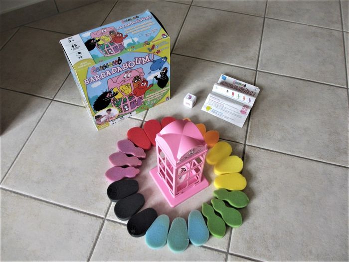 Jeu Barbadaboum - Dujardin Dès 3 ans. Jeu de précision et d’habileté. Bon état (des étiquettes sont abîmées et une du dé s’est décollée, une mousse est abîmée et la couleur de certaines est passée : voir photos).