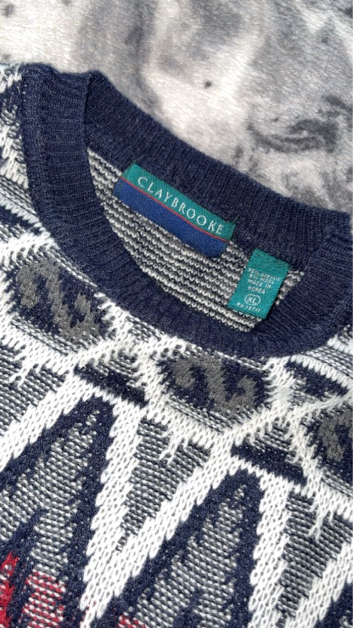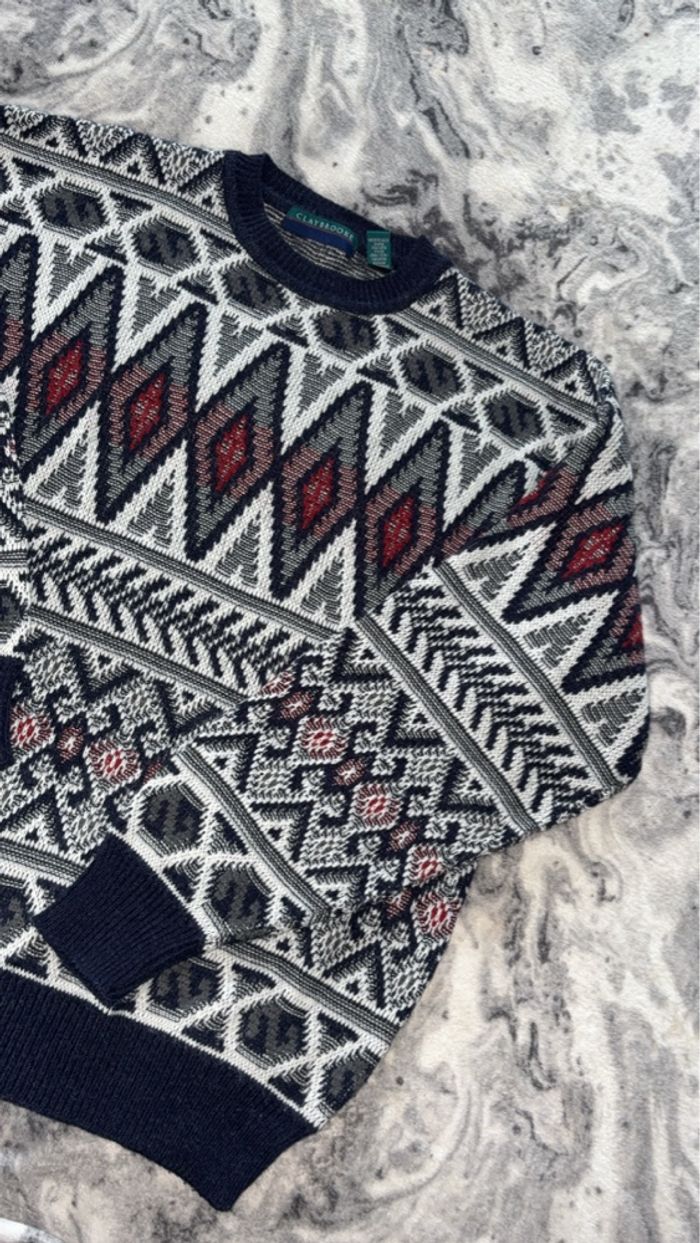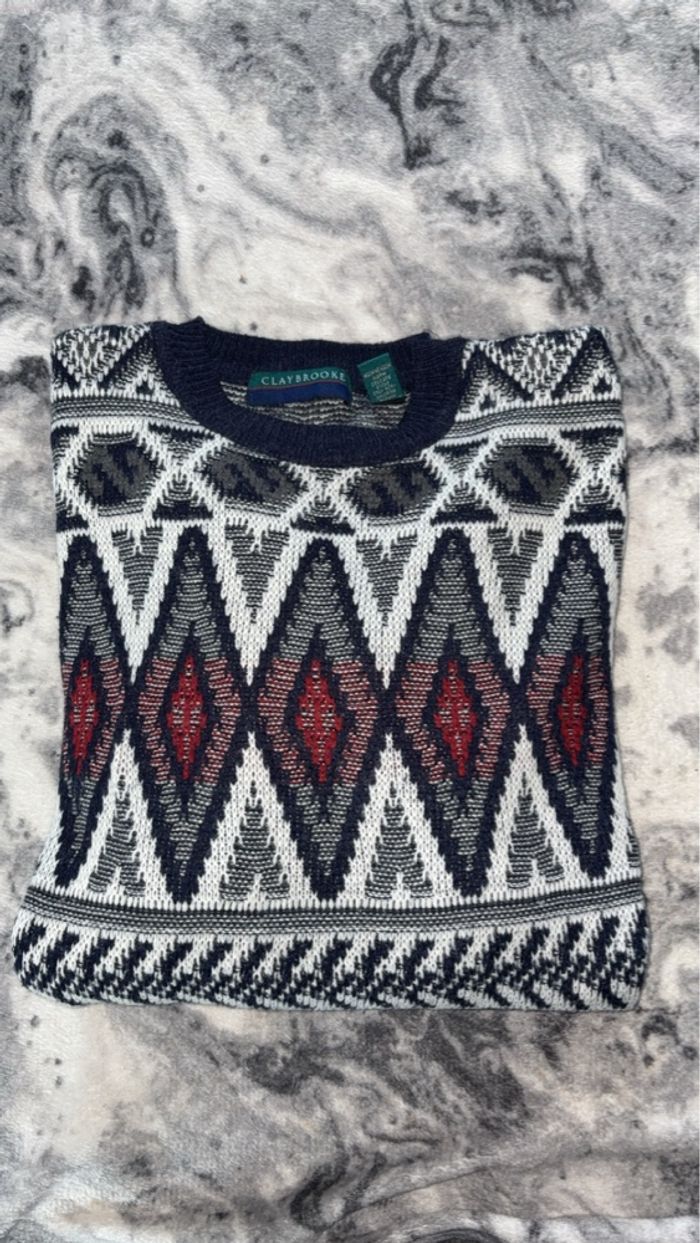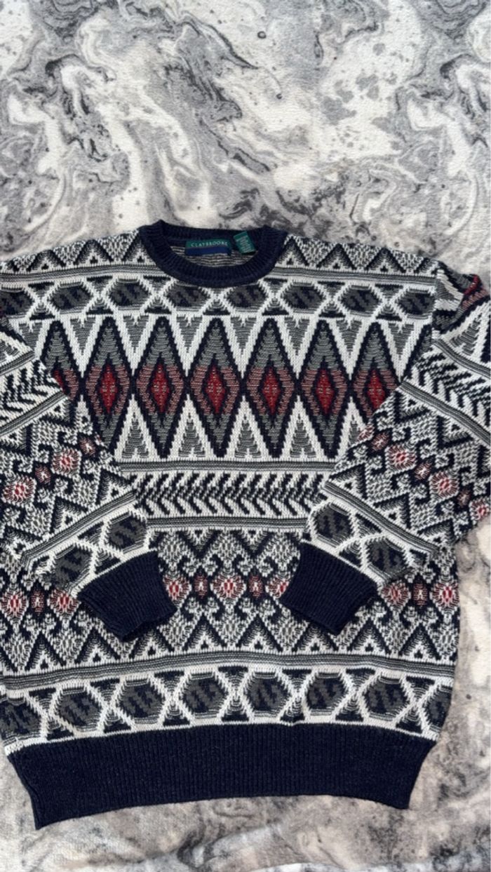 Magnifique pull vintage Claybrooke pour homme, taille M, avec de superbes motifs graphiques rétro.