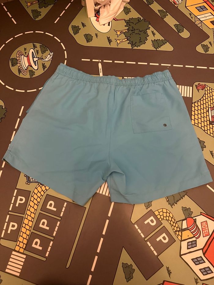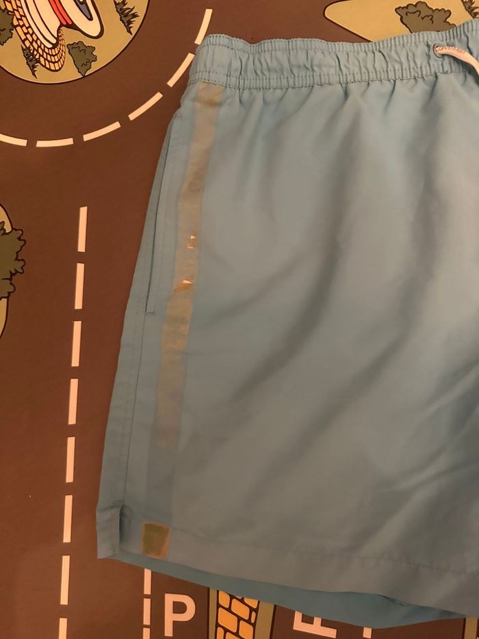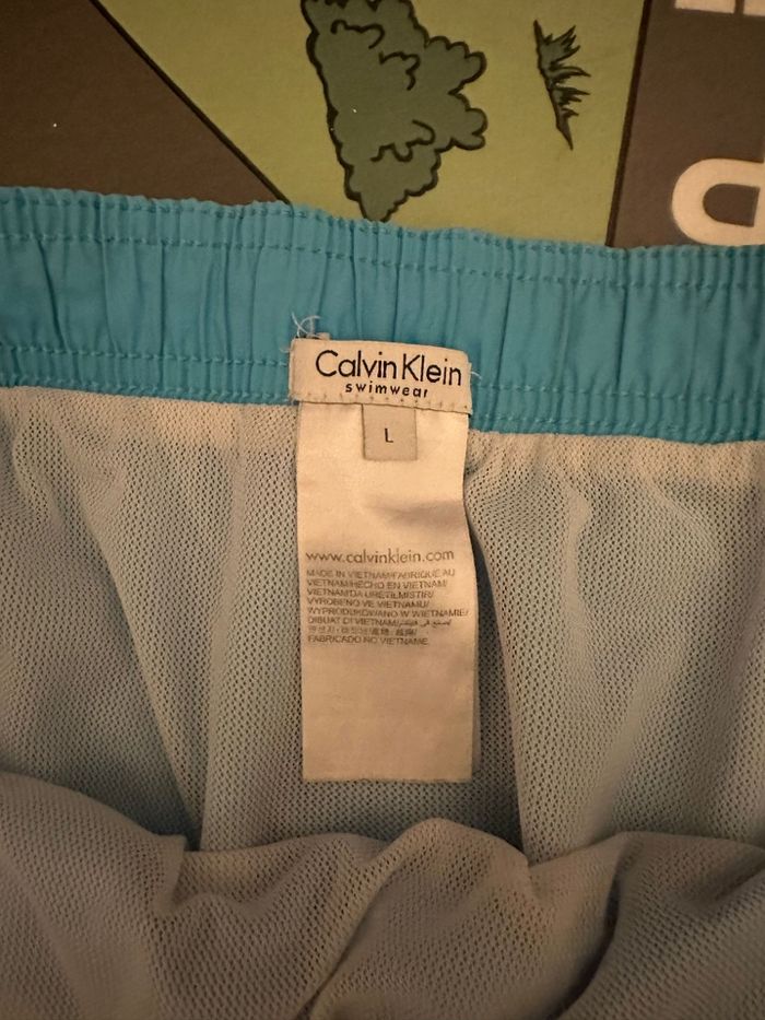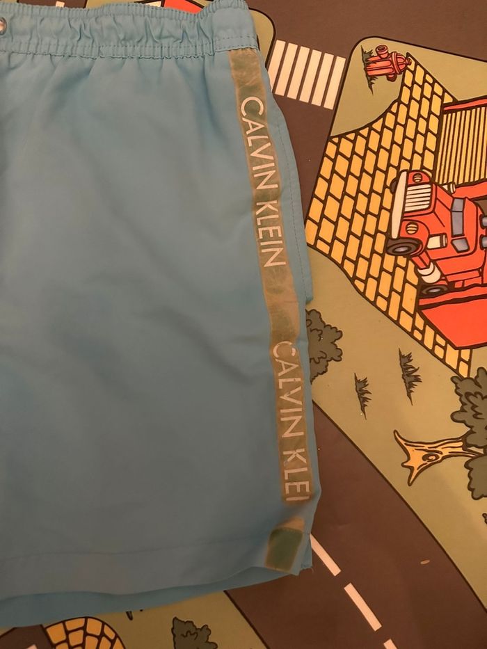 Short de bain Calvin Klein ( CK ) , couleur Bleu ciel . En bonne etat sauf sur un cote flocage enlever .