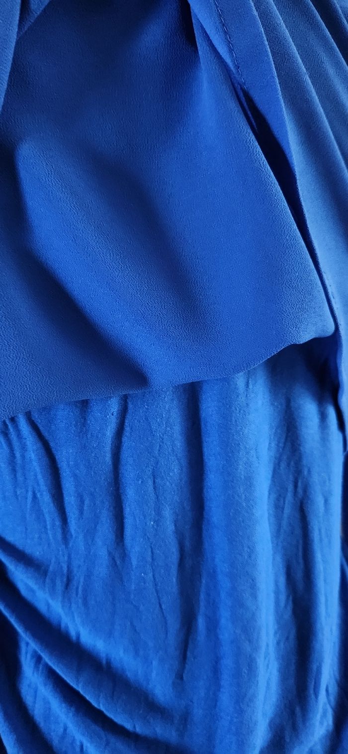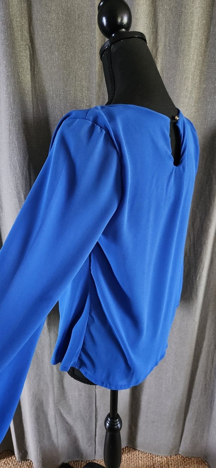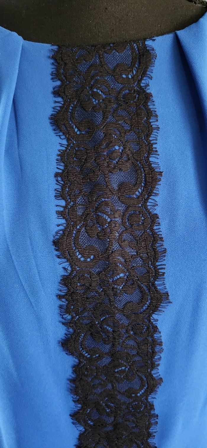 Joli haut bleu roi avec détails dentelle sur le devant. Matière voilage doublée. Excellent état, pas de défaut.