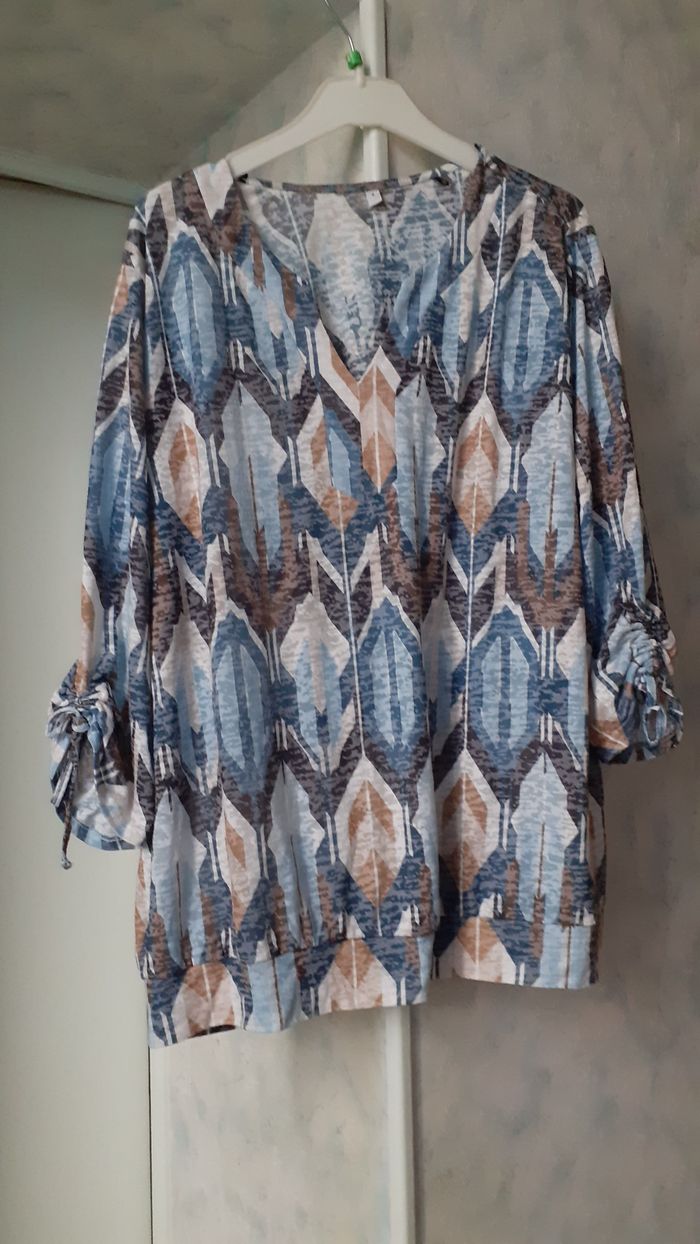 Vends un top manches 3/4 qui se froncent avec un lien, col en V, bandeau qui resserre sur les hanches, 67 % polyester, 33 % viscose, couleur gris bleu et beige, taille 6 sur l'étiquette, 48-50. Longueur de l'épaule à la base : 67 cm Largeur aisselle à aisselle : 58 cm Largeur au niveau des hanches : 54 cm.