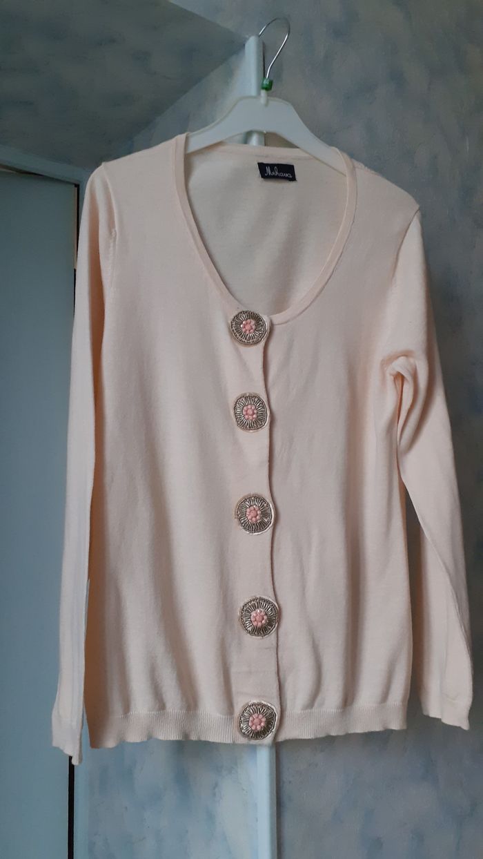 Vends un gilet en maille fine, 100 % coton, boutons pressions pour la fermeture, originaux, couleur saumon très clair, marque Mikava, taille S sur l'étiquette, 36-38. Longueur de l'épaule à la base : 63 cm Largeur aisselle à aisselle : 45 cm.