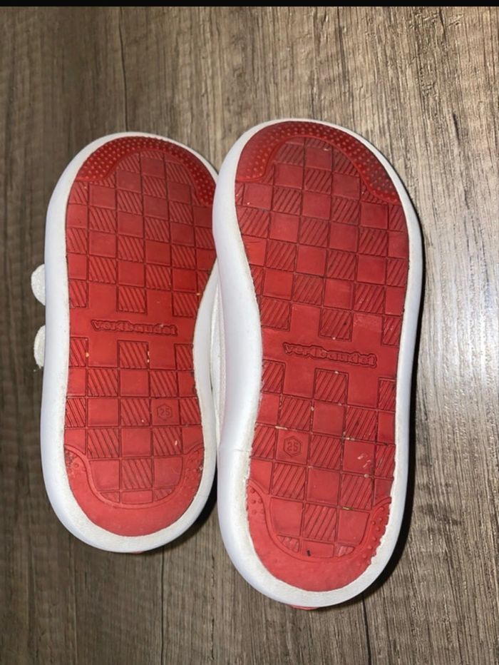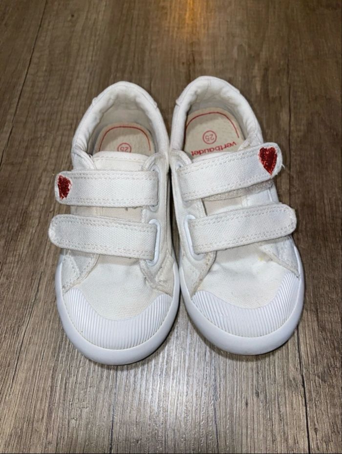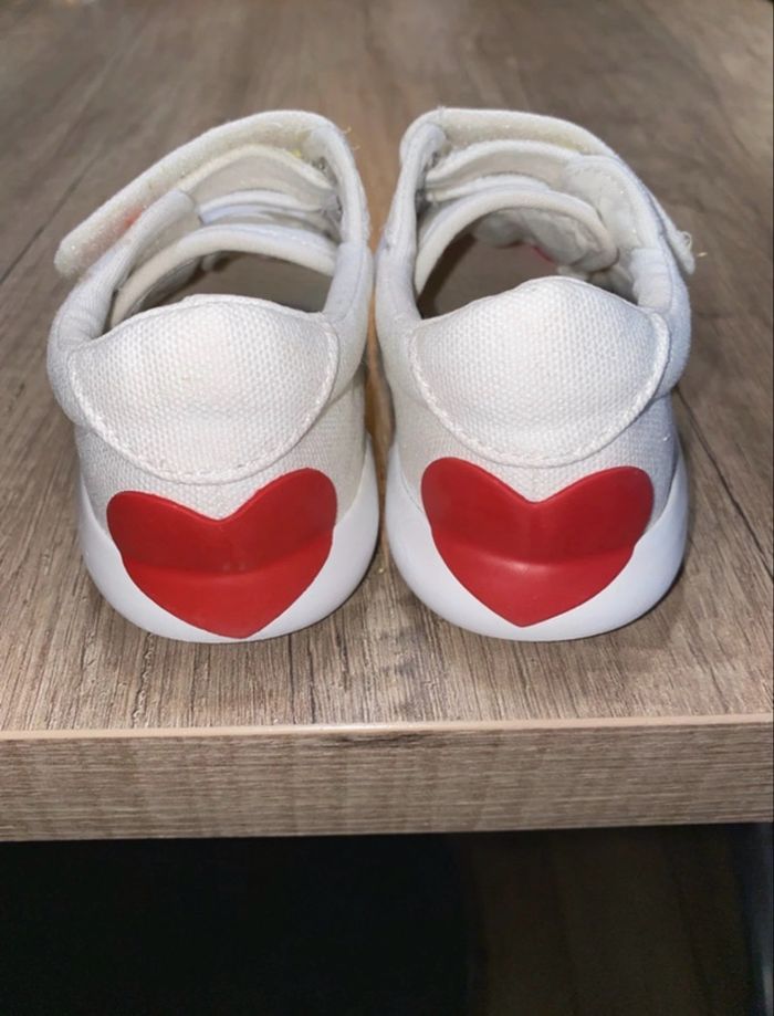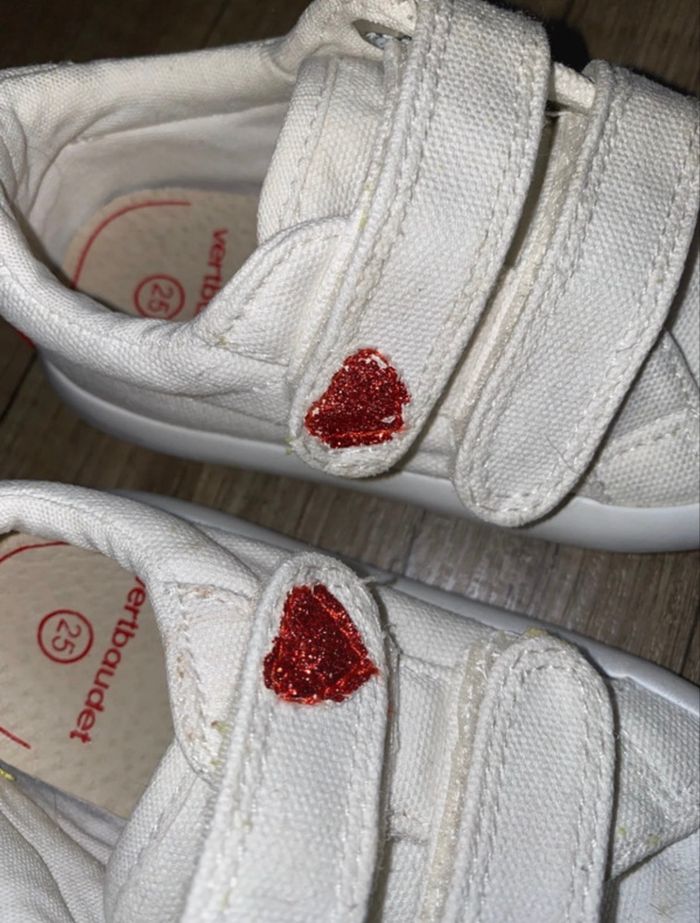 Chaussures très mignonnes, en très bon état Sur les dernières photos les cœurs pailletés rouges se sont déformés ( possibilités de les remplacer en cousant d’autre patchs à la place ), une tache verte à l’intérieur sur une semelle (qui ne gêne en rien le port des chaussures et n’est pas visible)