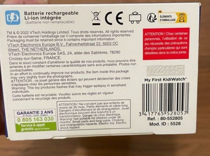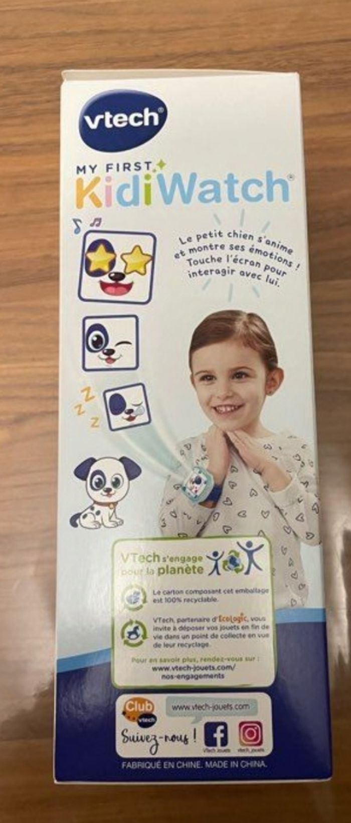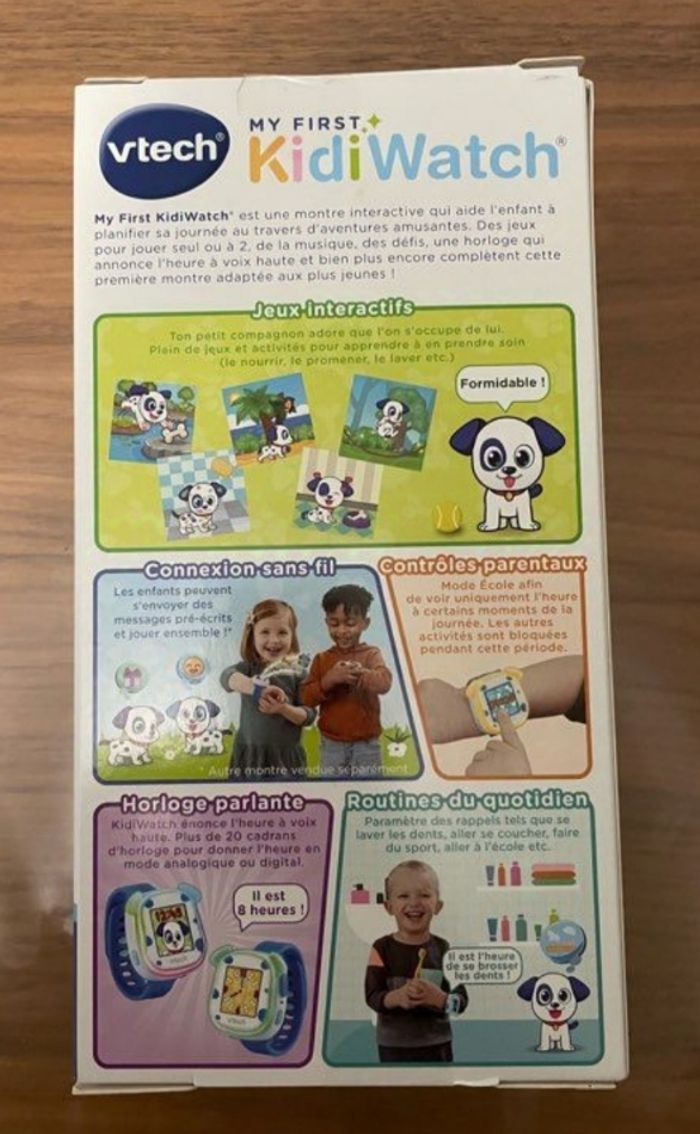 Merci de choisir mondial Relay pour la livraison Jamais ouvert Envoi possible De couleur bleue, la jolie montre NEUVE est à l'effigie d'un petit chien trop mignon. Elle s'illumine de 8 couleurs différentes pour créer des effets lumineux amusants ! Kidiwatch est la montre idéale pour permettre aux enfants, dès 3 ans, d'apprendre à lire l'heure, tout en s'amusant avec leur nouvel animal virtuel. Elle possède un écran couleur tactile de 1,44’’ à partir duquel l’enfant peut lire l’heure de façon digitale ou analogique. La montre interactive possède de nombreux fonds d’écrans, dont des écrans d’apprentissage de l’heure analogique avec un affichage des heures et des minutes, mais aussi une horloge parlante. En plus de ces fonctions classiques, la montre VTech pour enfants possède 4 jeux pour prendre soin et jouer avec son petit chien : routine quotidienne : les enfants s'amusent à prendre soin de leur animal en le toilettant, en cuisinant pour lui ou encore en partant en promenade. éducation canine : les enfants n'ont qu'à glisser leur doigt sur l'écran pour que le petit chien réponde à leurs ordres. répétition : en prononçant différentes phrases à voix haute, le petit chien s'amusera à les répéter. toutou aventure : les enfants partent à l'aventure avec leur animal. Ils doivent l'aider à traverser une rivière en sautant de rocher en rocher mais attention aux rondins de bois et aux crocodiles ! Ils découvriront également 3 mini-jeux d'observation, de logique et de rapidité, pour des heures de jeu. Pratique, ce jouet électronique éducatif fonctionne avec une batterie rechargeable intégrée. Elle possède également la fonction Bluetooth intégrée. Il est alors possible de communiquer d'une montre KidiWatch à une autre de façon sécurisée. Le bracelet souple de la montre s'adapte au poignet de l'enfant. La montre possède : la fonction arrêt automatique, 2 boutons de contrôle, 1 bouton Marche/Arrêt, 1 haut-parleur, 1 micro intégré pour interagir dans les jeux et 1 câble micro USB.