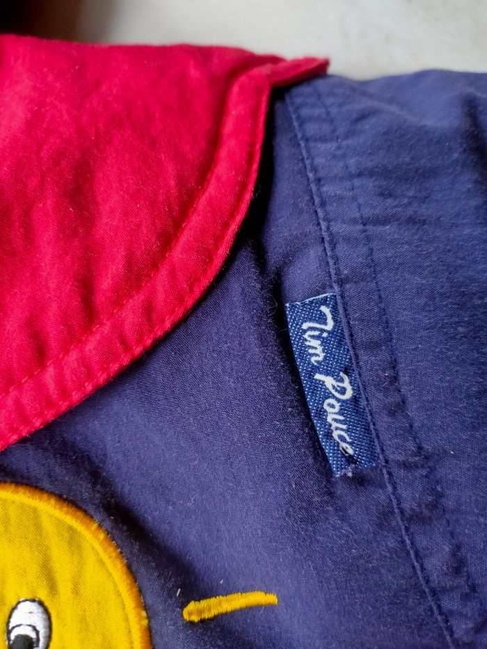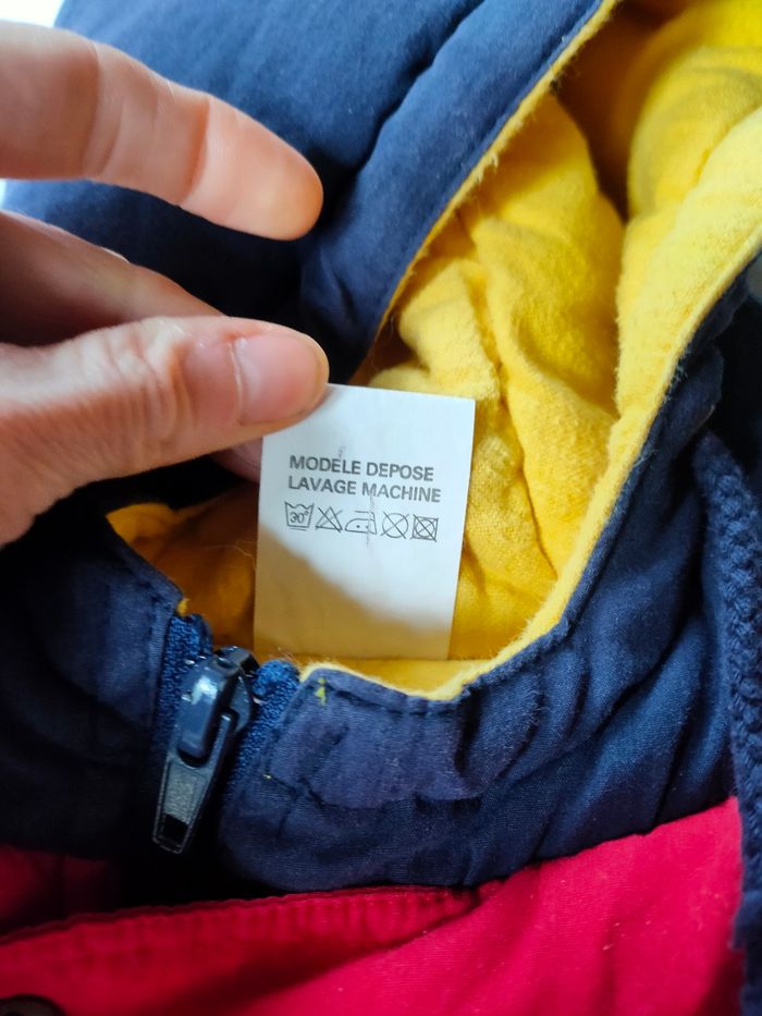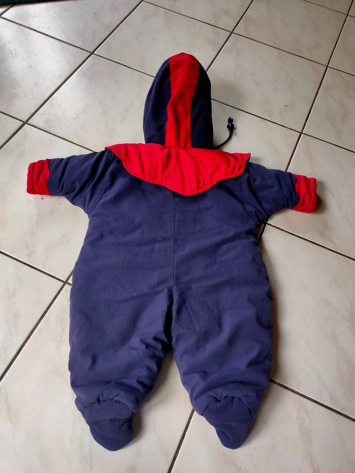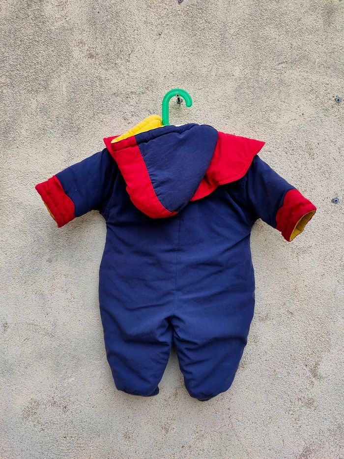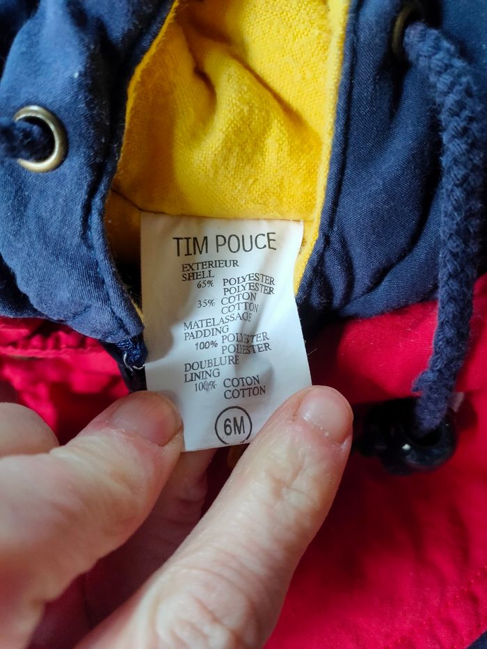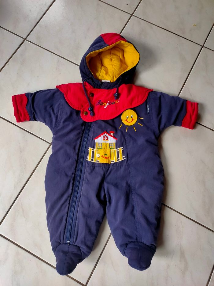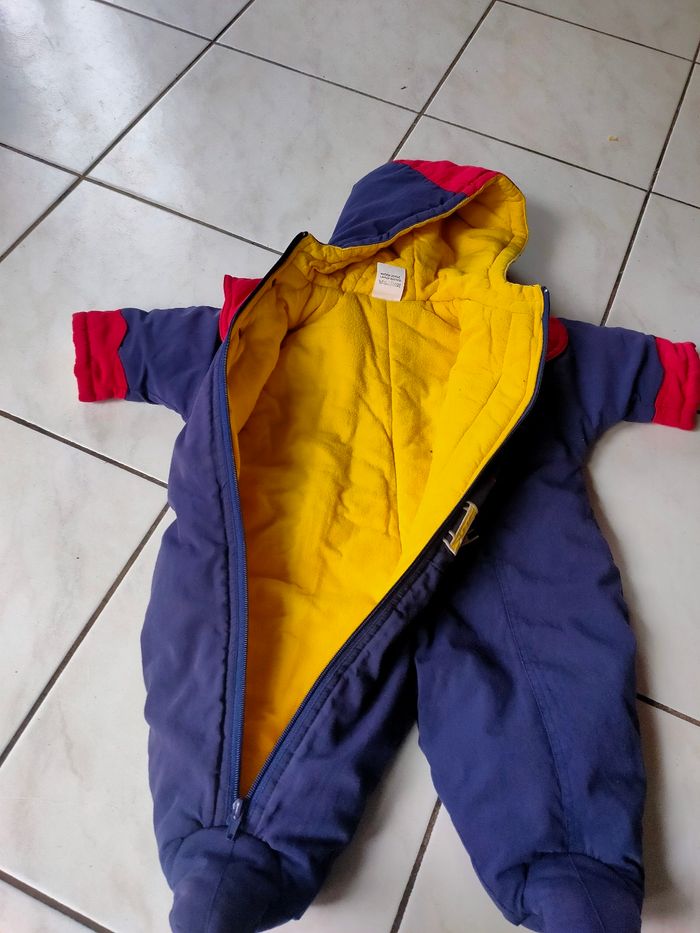 Combinaison coloris bleu marine/rouge et intérieur jaune, chaude, fermeture éclair, avec capuche et col. Taille 6 mois, marque Tim Pouce, modèle Vintage. Elle a été porté, l'intérieur a des bouloches, hormis ce défaut, elle est en très bon état. Composition : voir photo étiquette. Prix ferme, PAS DE NÉGO !!!