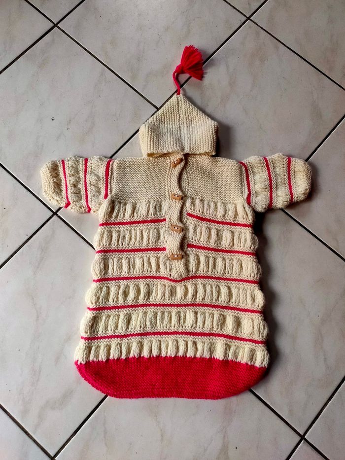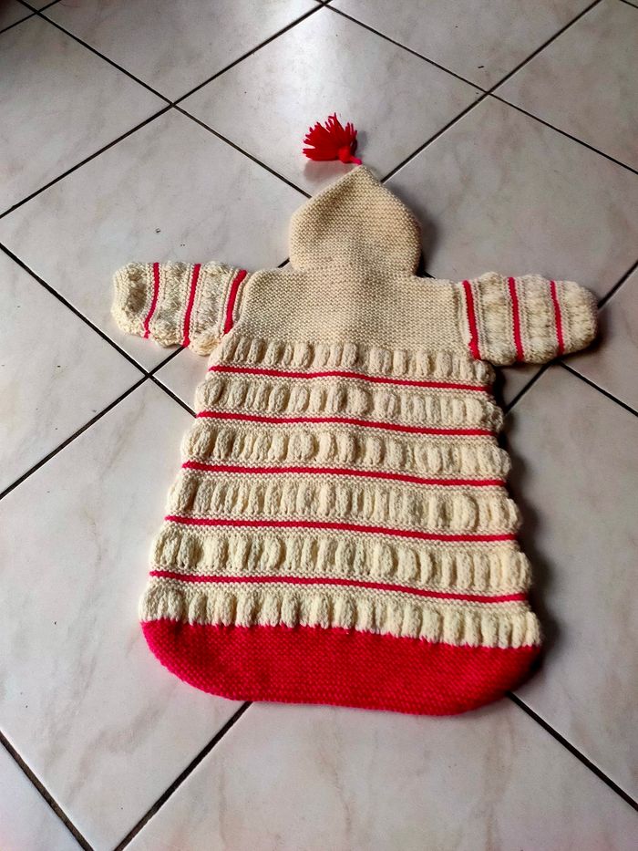 Jolie nid d'ange en maille coloris crème et rose framboise, avec manches et capuche. Fermeture avec boutons en bois. Il a été réalisé a la main, il n'a donc naturellement pas d'étiquettes taille/composition. Taille 0/3 mois. Il est en excellent état, a finalement été très peu porté. C'est un modèle Vintage. Prix ferme, PAS DE NÉGO !!!