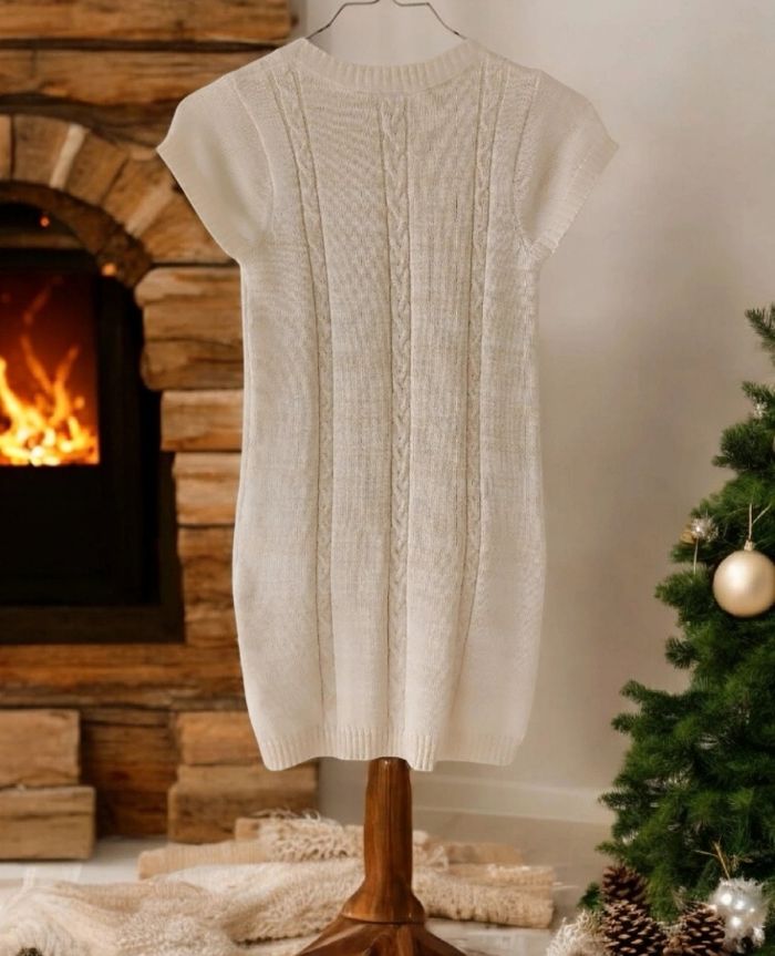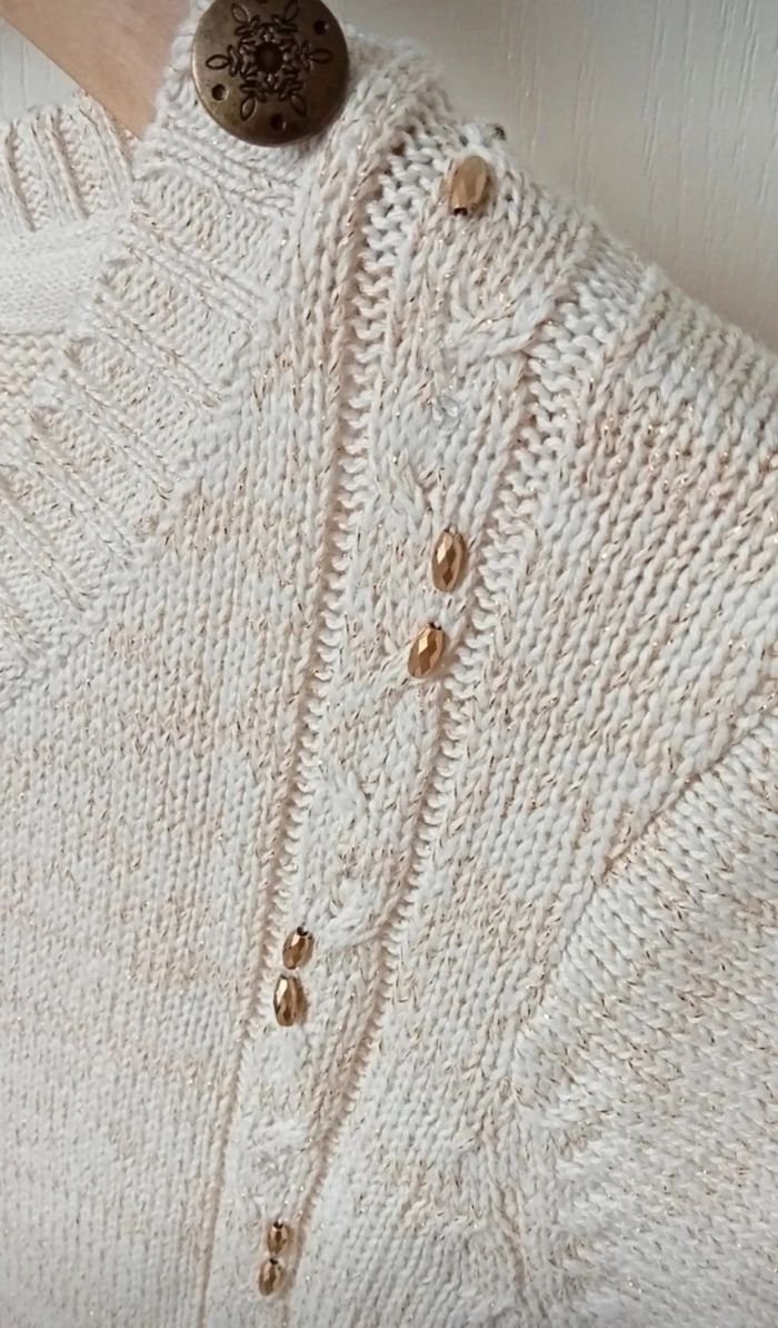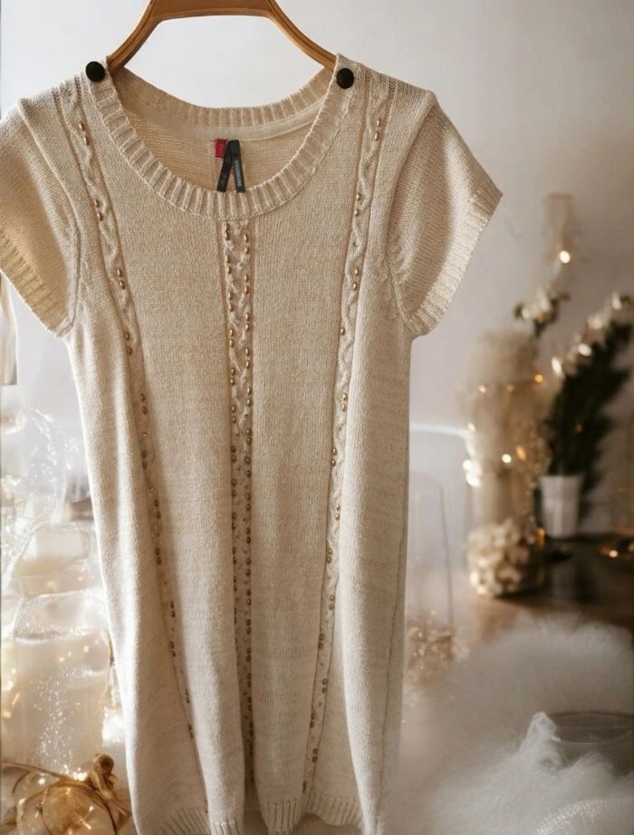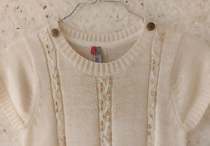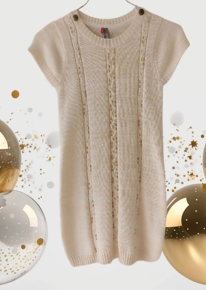 ✨ Robe manches courtes en tricot. Coloris blanc cassé, effet chiné. Parsemés de perles dorées, elle est ornée de 2 boutons à l'encolure.