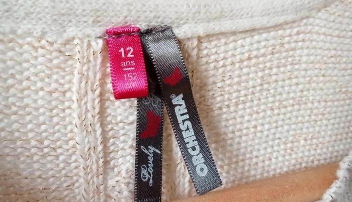 Encolure ronde. Bords en bord-côte. Jeu de mailles torsadées devant et au dos.