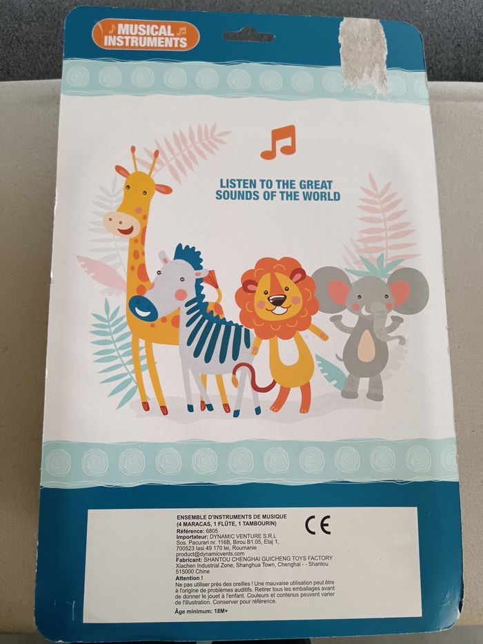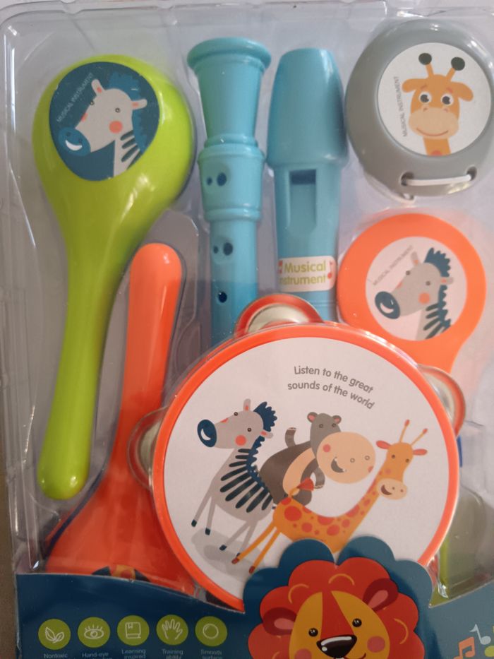 Instruments de musique enfant. Theme animaux de la jungle. Contient un tambourin, une flûte et des maracas. Neuf.