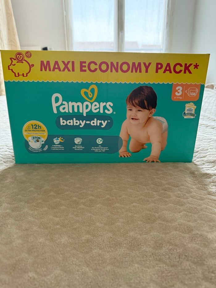 Carton de couches Pampers taille 3. 136 couches Plusieurs disponibles si besoin.