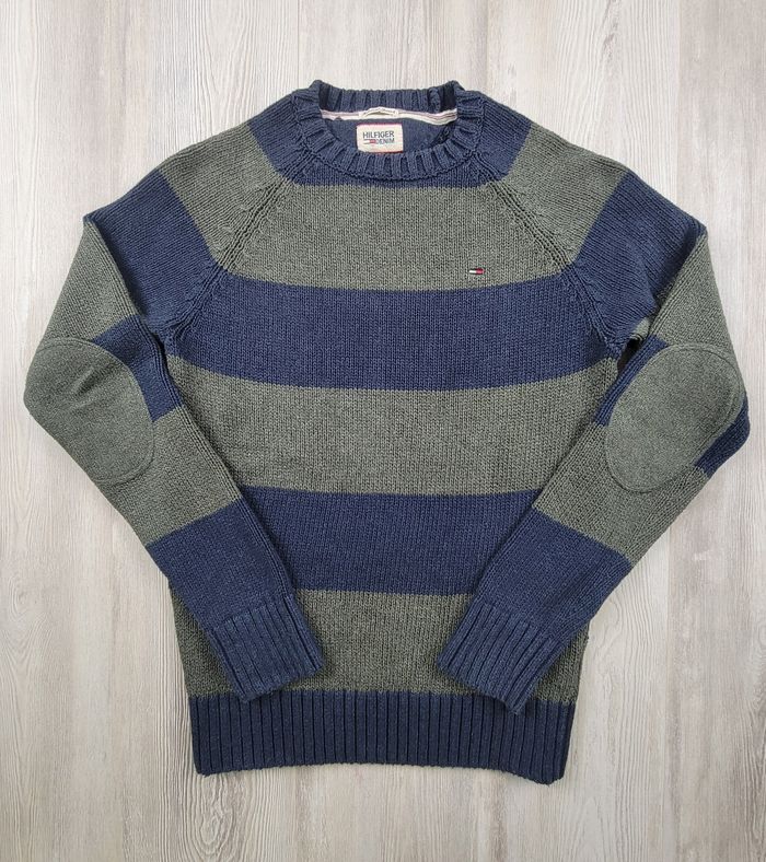 Pull Tommy Hilfiger Denim à col rond, style casual premium. Rayures bleu marine et vert militaire, maille épaisse et qualitative, idéale pour l’automne/hiver. • Taille : S • Matière : 100 % coton • Maille épaisse avec renforts aux coudes • Manches longues • Petit logo Tommy Hilfiger brodé sur la poitrine • Étiquettes “Hilfiger Denim” et “American Brand” dans le col Mesures à plat : – Épaules : 46 cm – Manches : 62 cm – Longueur : 67 cm État : excellent, aucun trou, aucune tache, aucune bouloche. Coupe confortable, facile à porter. Envoi rapide et soigné. N’hésitez pas si vous avez des questions. #27-02