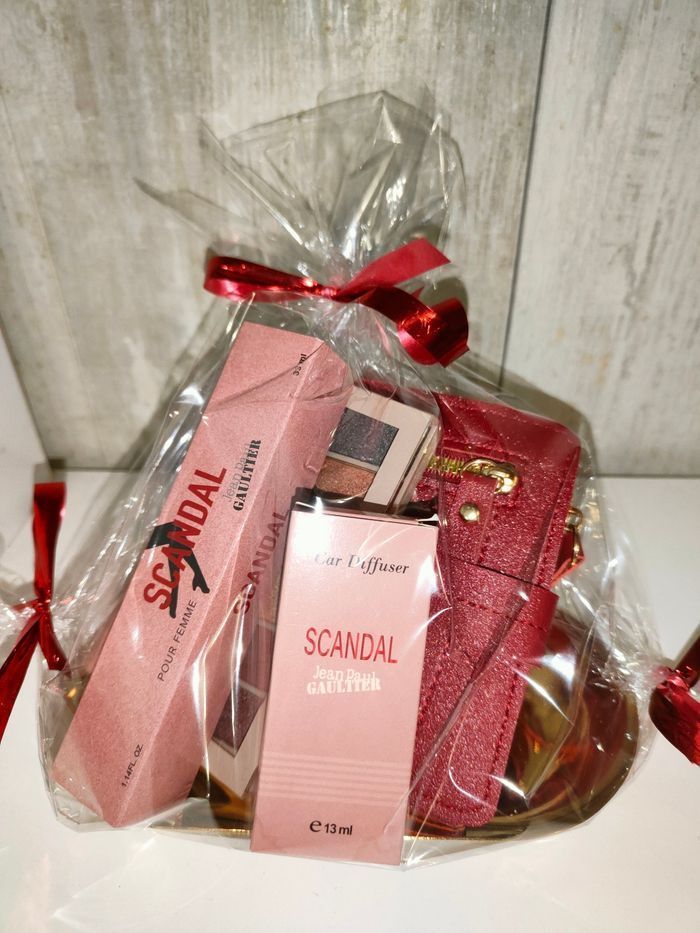 Coffret femme neuf comprenant 1 parfum 1 diffuseur voiture 1 palette de maquillage 1 portefeuille 1 plateau de décoration couleur or