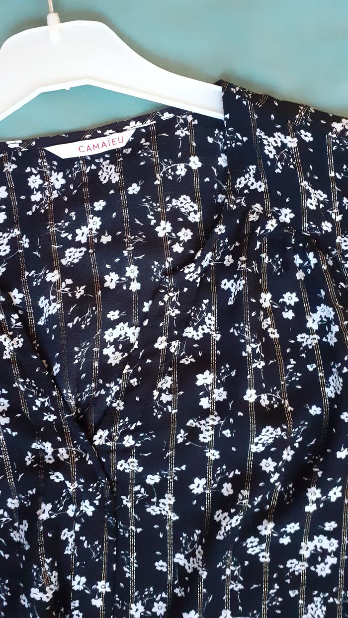 Vends un top manches longues 99 % viscose, 1 % fil métallique, col en V, couleur noir avec petites fleurs blanches et fils argentés, marque Camaïeu, taille 38. Longueur de l'épaule à la base : 63 cm Largeur aisselle à aisselle : 47 cm.
