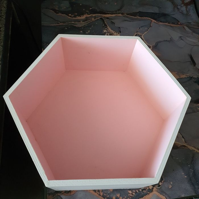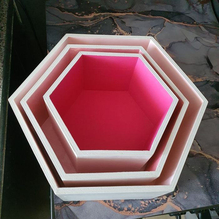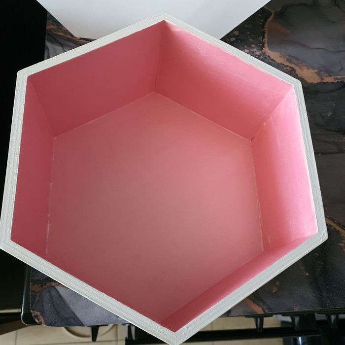 Lot 3 boites hexagonales en bois, customisés. Fixations pour accrocher au mur Grande 30 cm, rose poudre Moyenne 25 cm, rose nacré Petit 20 cm, rose framboise Extérieur blanc Profondeur 12.5 cm