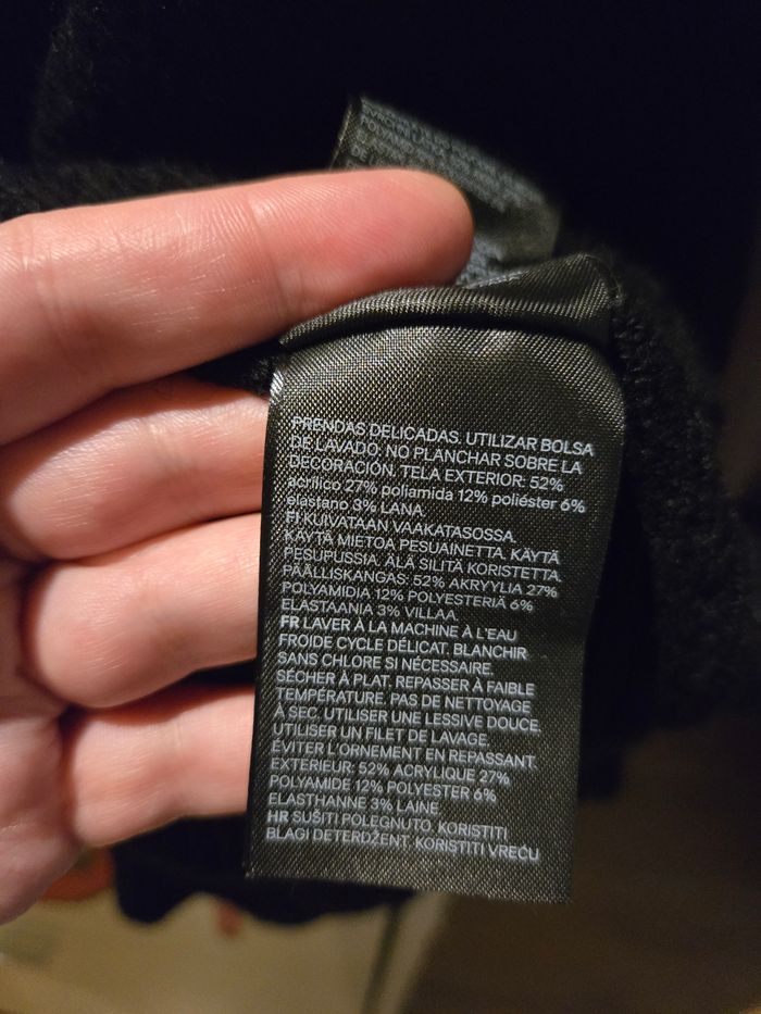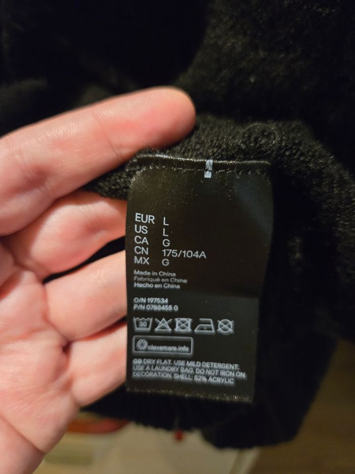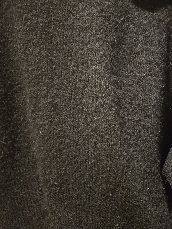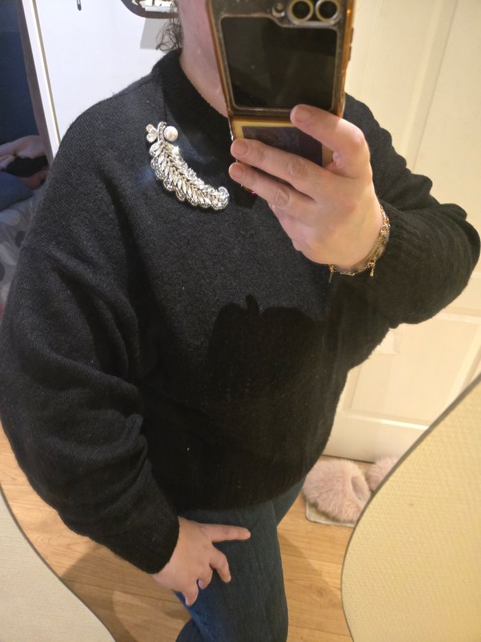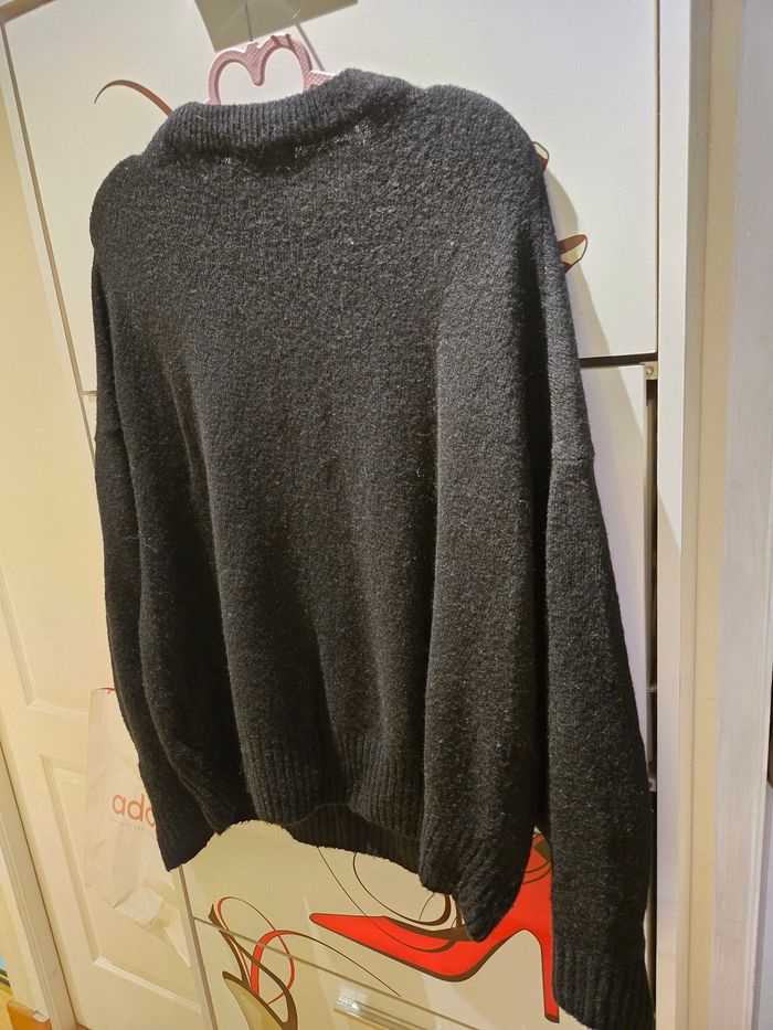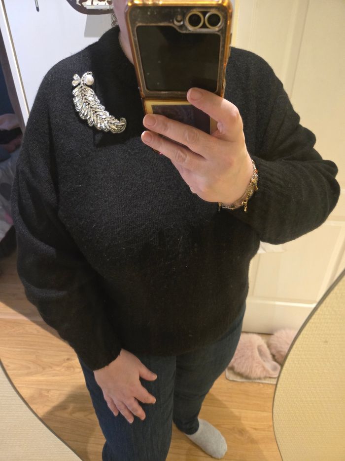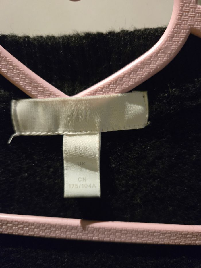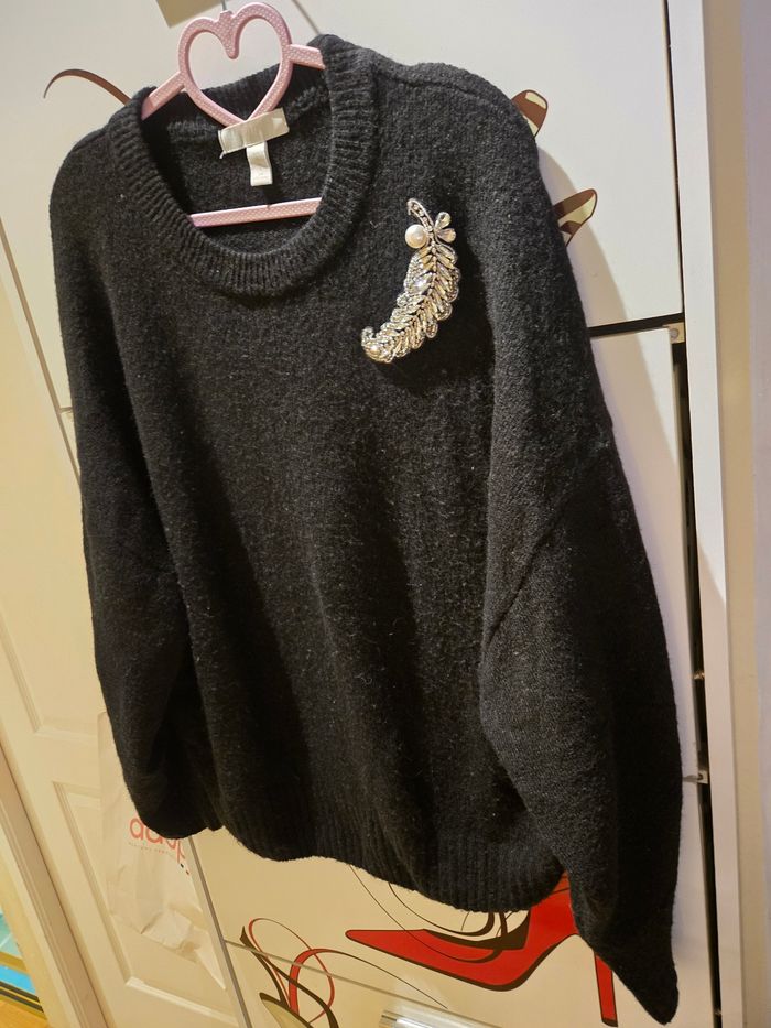 Joli pull court, fin mais chaud à col rond noir orné d’une feuille en strass et perle, pour femme en bon état. Taille : L oversize pouvant aller jusqu'au 44 max. Matières : 52% acrylique, 27% polyamide, 12% polyester, 6% élasthanne et 3% laine. Dimensions : environ 64 cm de long, 60 cm de large sous les bras, 46 cm de large en bas, 40 cm de largeur d'épaule à épaule, 39 cm de longueur de manche, entre 10 et 25 cm de largeur de manche et 30 cm de largeur d’emmanchure entre l'épaule et l'aisselle. Marque : H&M. Pas d'échange, merci. Envoi rapide via Mondial Relay.